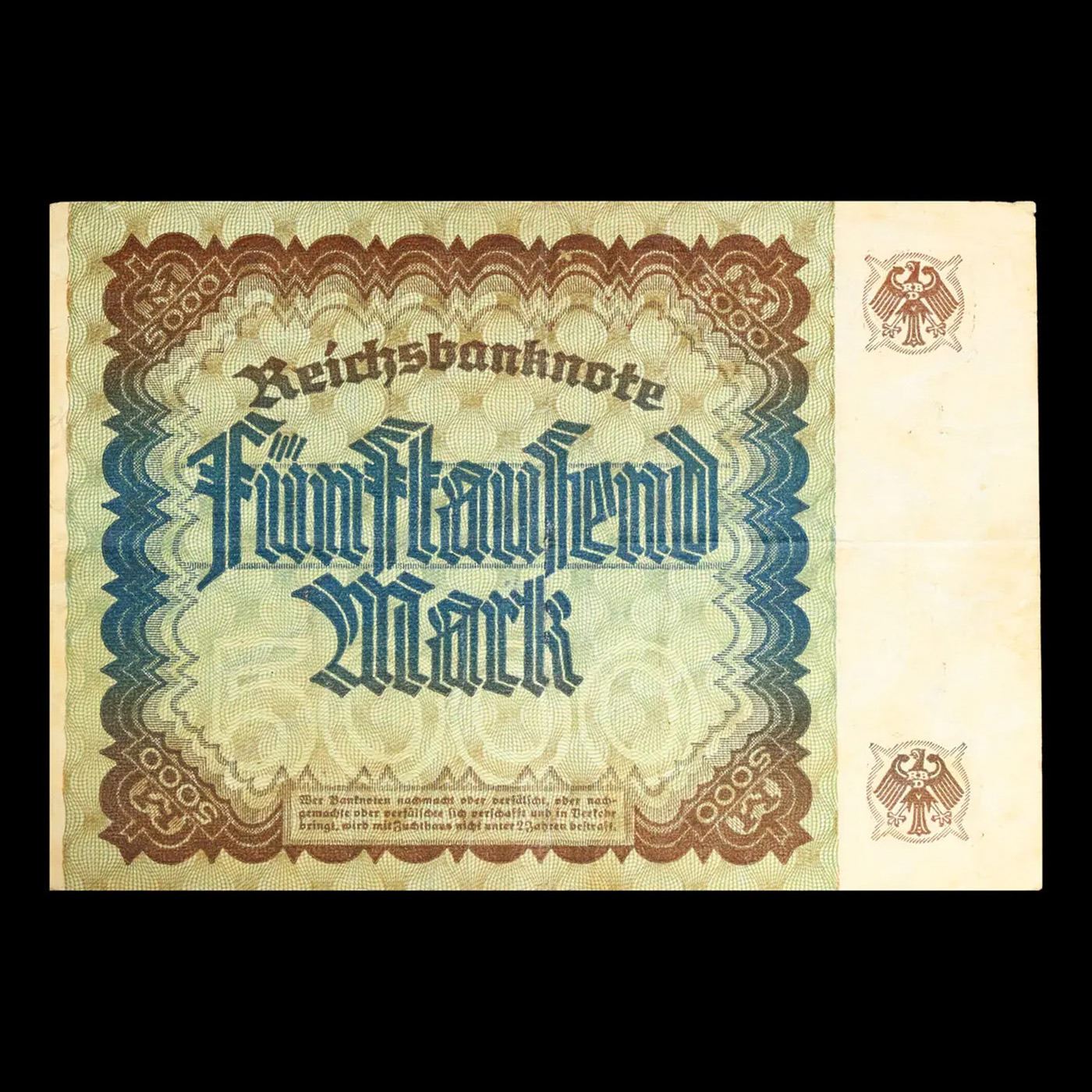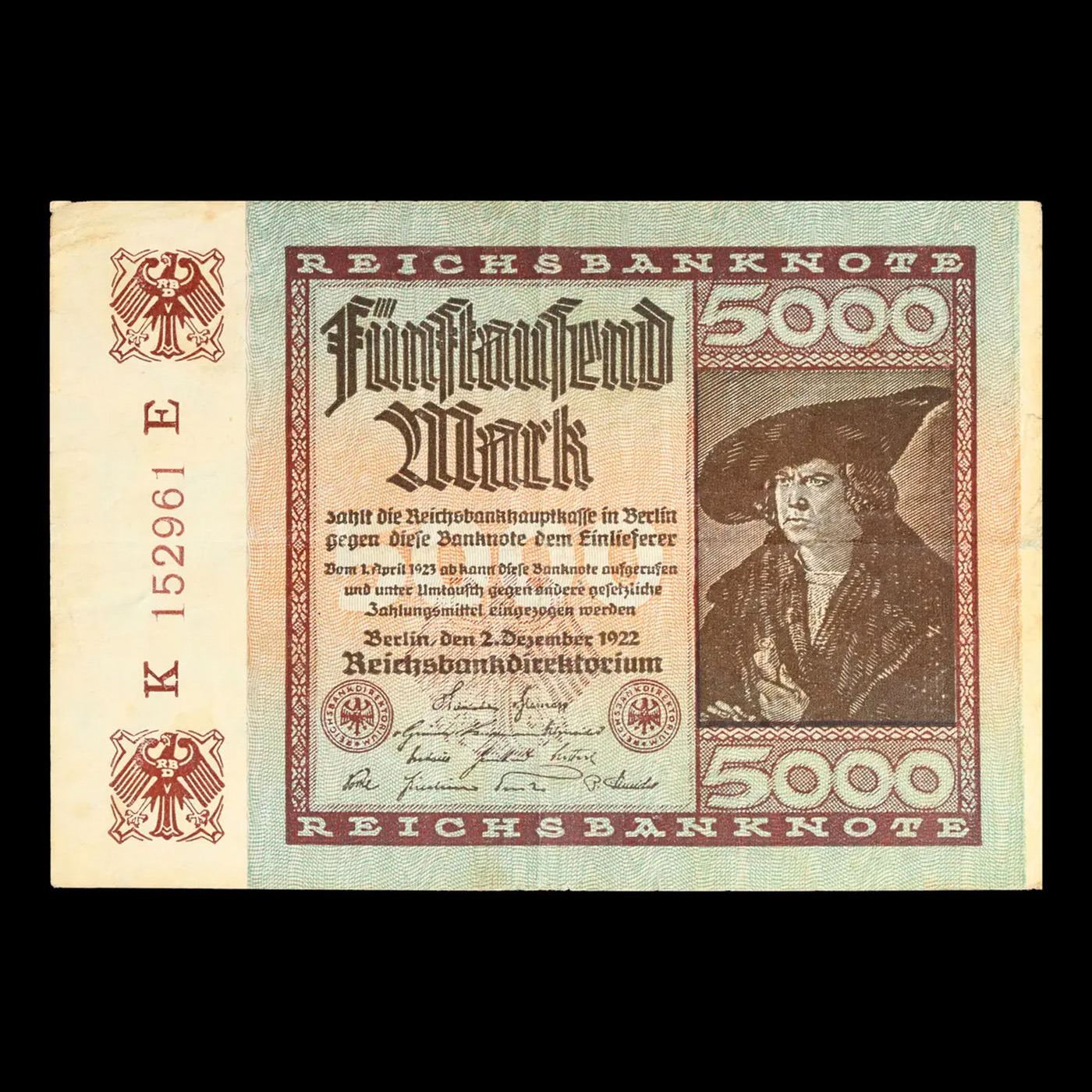 1922 Waimar Germany 1,000 Mark Note P# 81C Grades xf+. In the early 1920s, post-WWI Germany saw its economy spiraling out of control. Hyperinflation started directly after the war in 1918, but truly took over the Weimar Republic from 1921 to 1923. The value of the Mark declined incredibly rapidly. 1 USD was equal to 50 German Marks at the beginning of 1920. Toward the end of 1923, 1 USD was equal to over 4,200,000,000,000 German Marks. At times, denominations of the Mark became less valuable than the paper and labor to print it almost immediately after printing. Thus, denominations of the Mark notes became incredibly large, ending up in the tens of trillions.