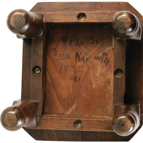<B>1922 Walnut Footstool Handmade by James Naismith.</B></I> The considerable carpentry talents of Dr. Naismith are evident in this 8x10x11" footstool crafted entirely by his hand. Underside is burnt with the inscription, "Made by Jas. Naismith, 1922, H.N.D." The initials stand for "Helen Naismith Dodd," his daughter, to whom the work was presented. This is one of only two relics from Naismith's carpentry bench known to exist, and the family retains the other. This would serve marvelously as a display stand for an important vintage basketball artifact, perhaps another lot featured in this auction.<BR><BR><b>Shipping:</b> Small Collectibles (<a target="_blank" href="http://www.heritageauctions.com/common/shipping.php">view shipping information</a>)