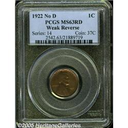 <B>1922 Weak D 1C MS63 Red PCGS.</B></I> The D mintmark is very faint but completely outlined. The satiny gold and lilac-tan surfaces are lightly abraded and have only a hint of carbon. Although not as coveted as its Strong Reverse counterpart, the Weak D 1922 is nonetheless rarely encountered in Red Uncirculated grades. The borders are blurry, as made from worn-out dies.
