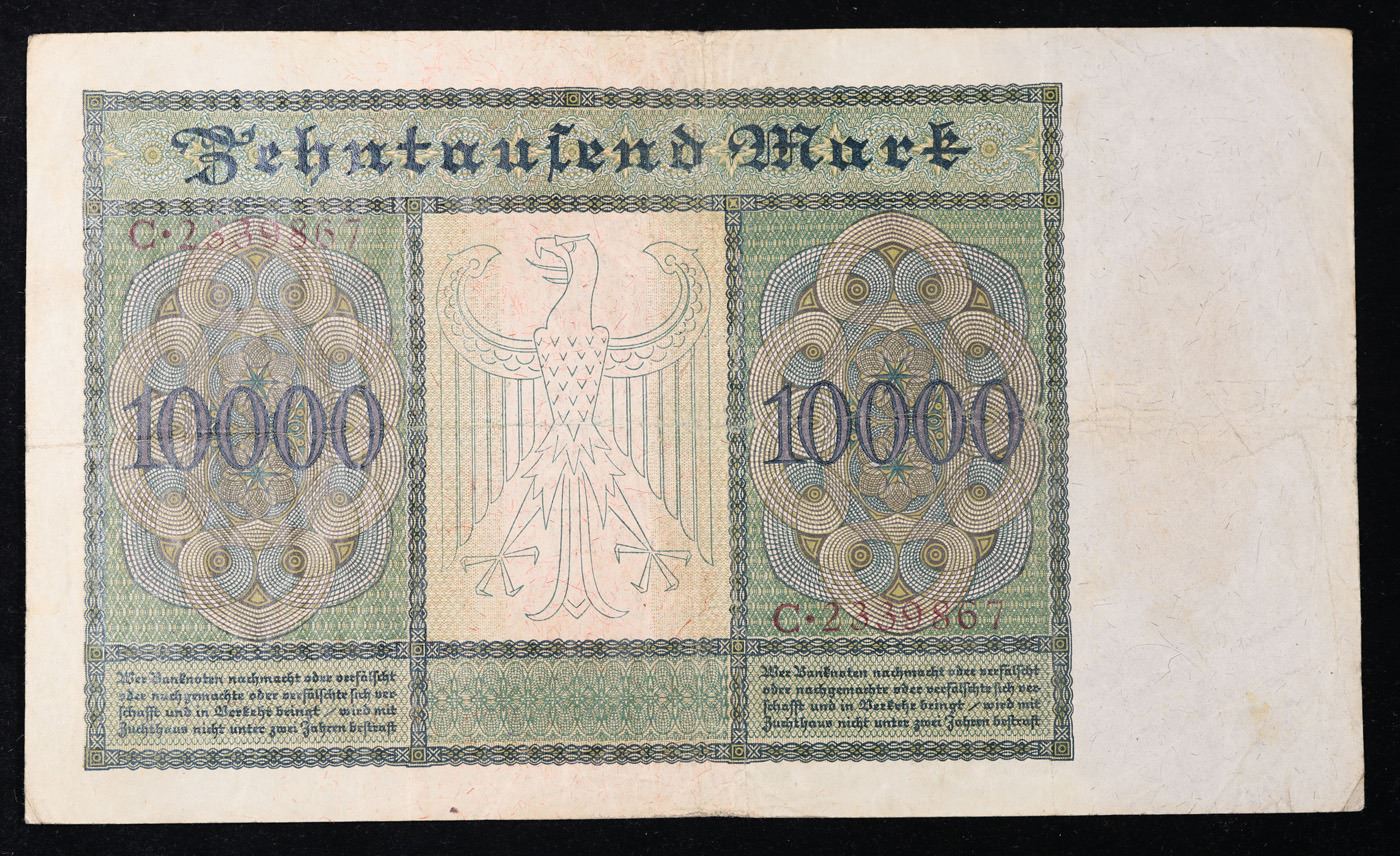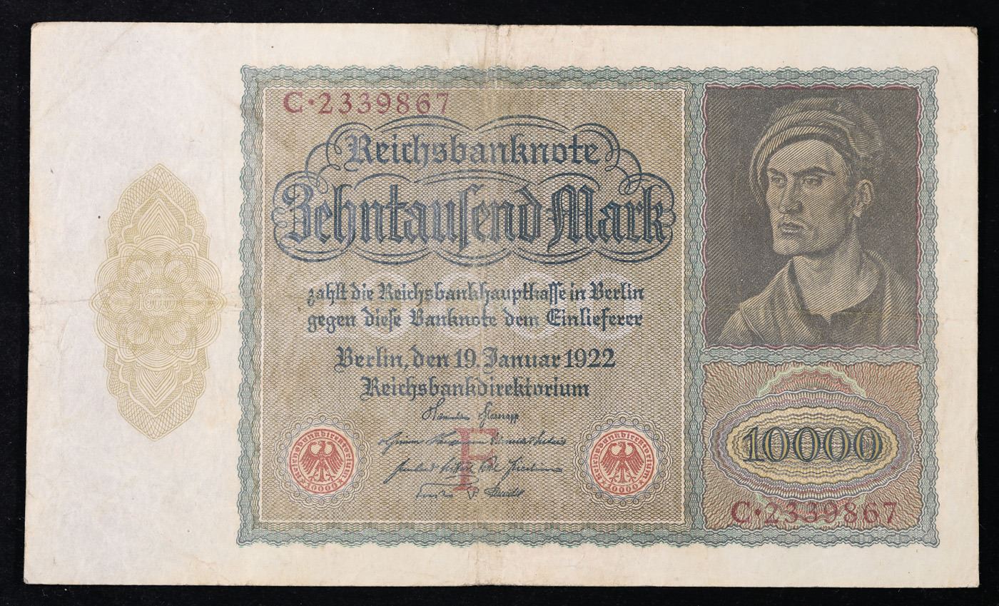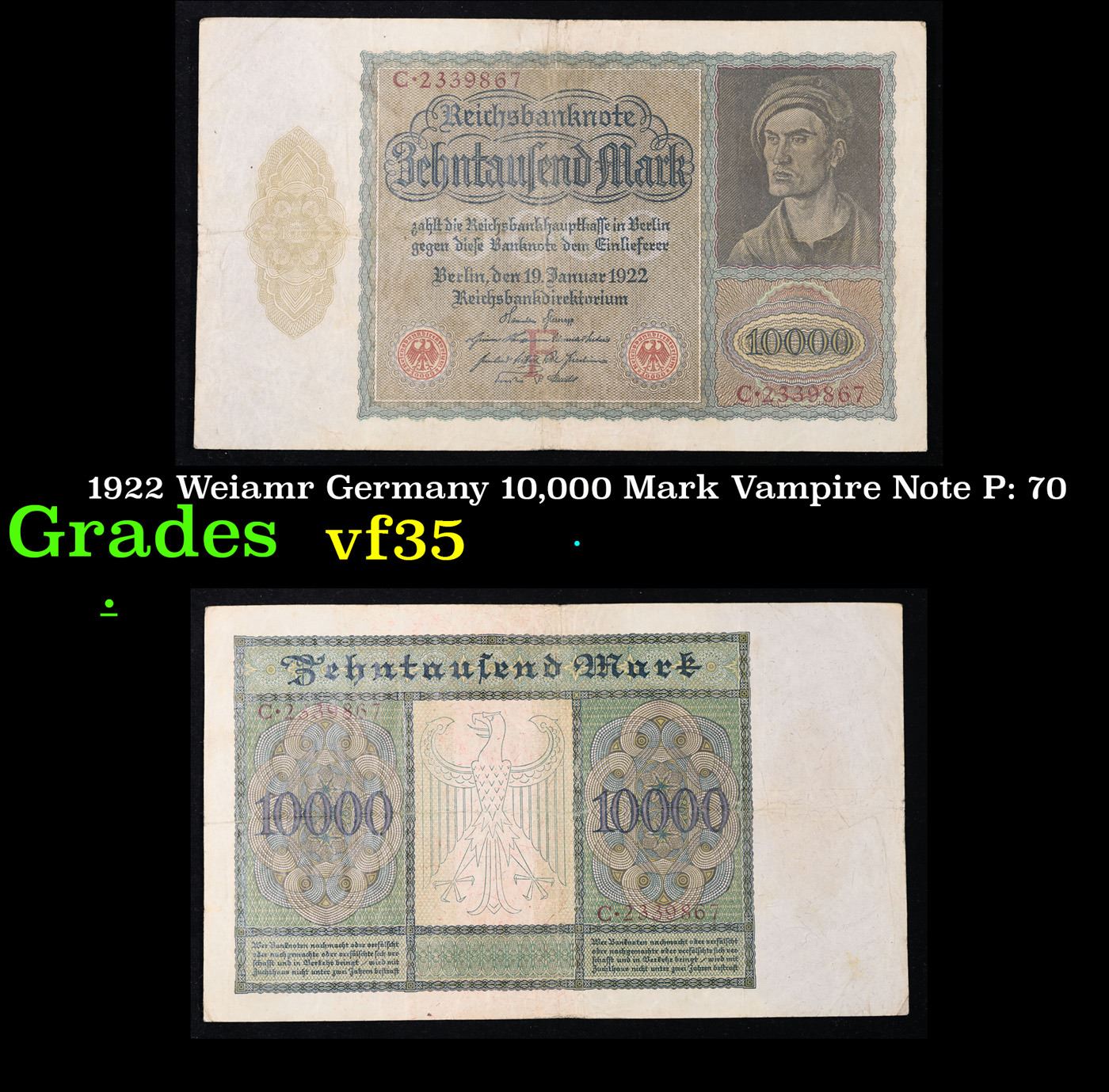 1922 Weiamr Germany 10,000 Mark Vampire Note P: 70 Grades vf++. Among the many bills issued during the hyperinflation crisis in the post-WWI German Weimar Republic, the "Vampire Note" is a particular standout. It is known as the Vampire Note because when the note's engraver (identity unknown) adapted a portrait by famous German Renaissance painter Albrecht Durer for the note, he made an odd alteration where the neck of the figure looks like a Vampire when the bill is rotated 90 degrees. It takes some imagination to see, but was intentional and meant to represent the anti-French sentiment in WWI Germany -- France was considered to be "sucking the life out of" the country following the signing of the Treaty of Versailles. The Reichsbank noticed this alteration, but did not change it, printing several varieties of the bill with the design and giving credence to the popular anti-French sentiment. There are three varieties, Pick # 70 and 71 differing in the reverse design, and Pick # 72 being a smaller version of Pick # 71.