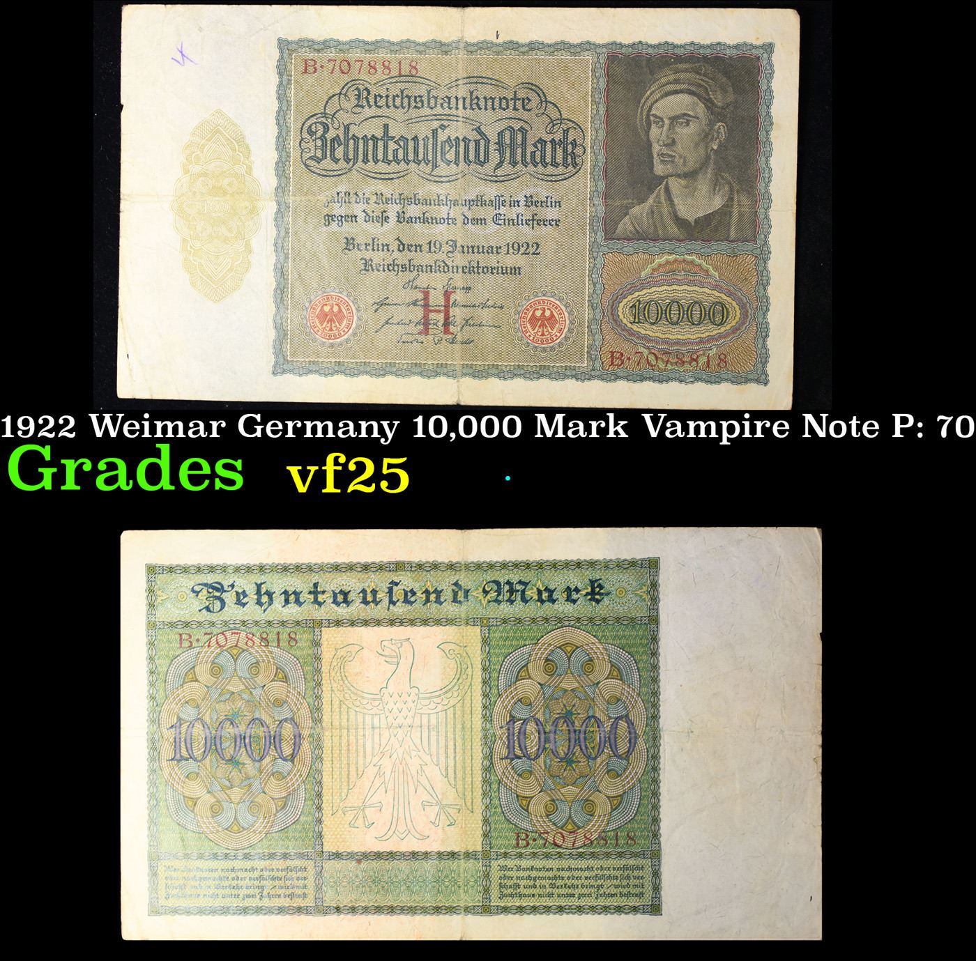 1922 Weimar Germany 10,000 Mark Vampire Note P: 70 Grades vf+