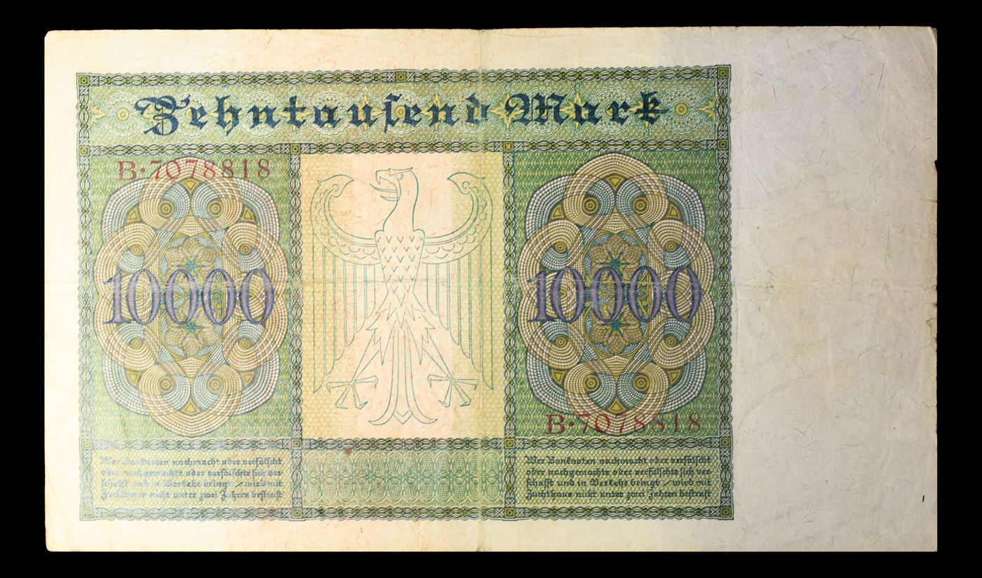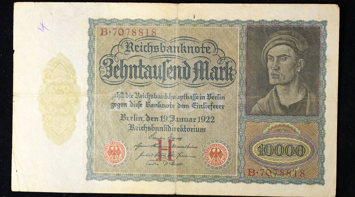 1922 Weimar Germany 10,000 Mark Vampire Note P: 70 Grades vf+. In the early 1920s, post-WWI Germany saw its economy spiraling out of control. Hyperinflation started directly after the war in 1918, but truly took over the Weimar Republic from 1921 to 1923. The value of the Mark declined incredibly rapidly. 1 USD was equal to 50 German Marks at the beginning of 1920. Toward the end of 1923, 1 USD was equal to over 4,200,000,000,000 German Marks. At times, denominations of the Mark became less valuable than the paper and labor to print it almost immediately after printing. Thus, denominations of the Mark notes became incredibly large, ending up in the tens of trillions.