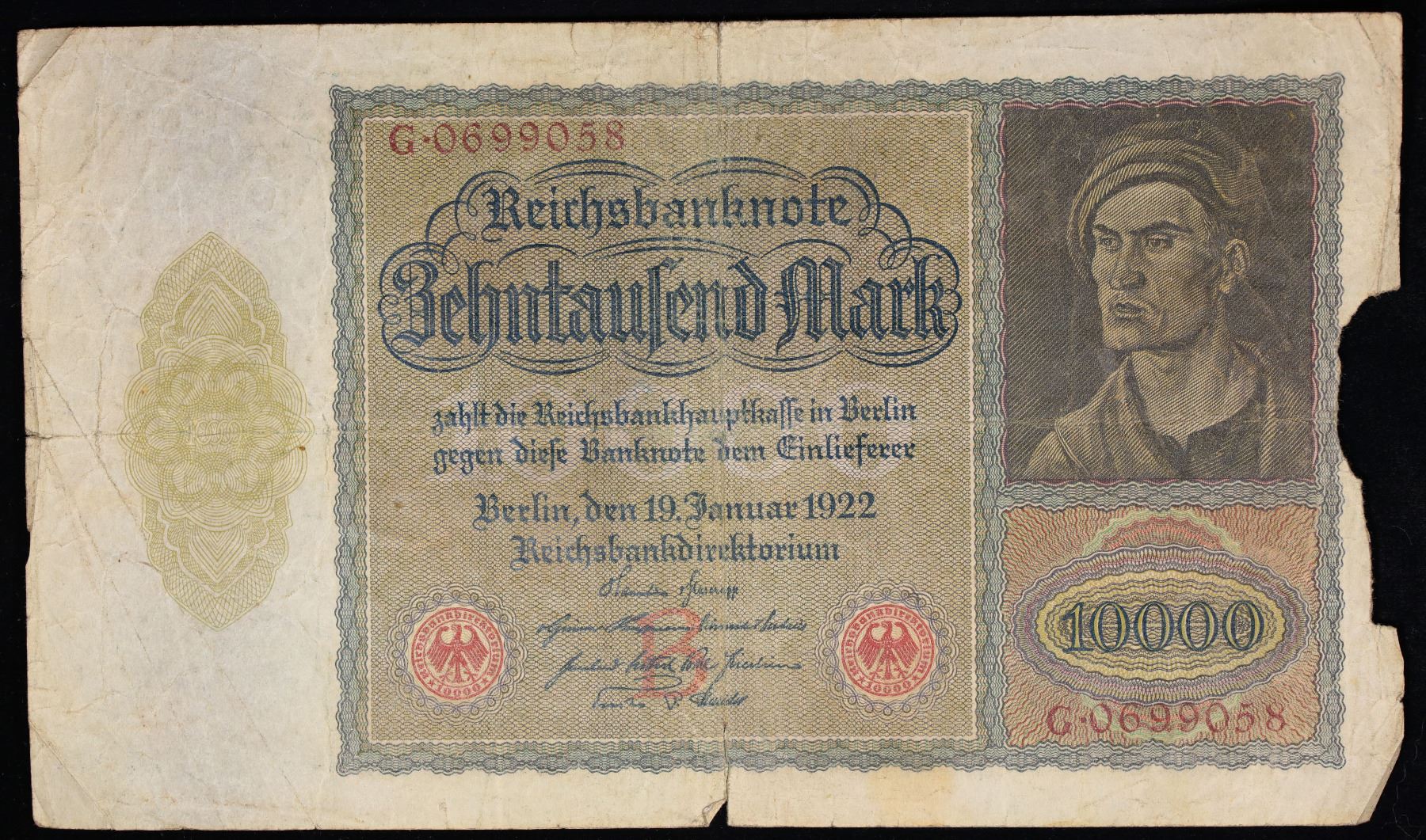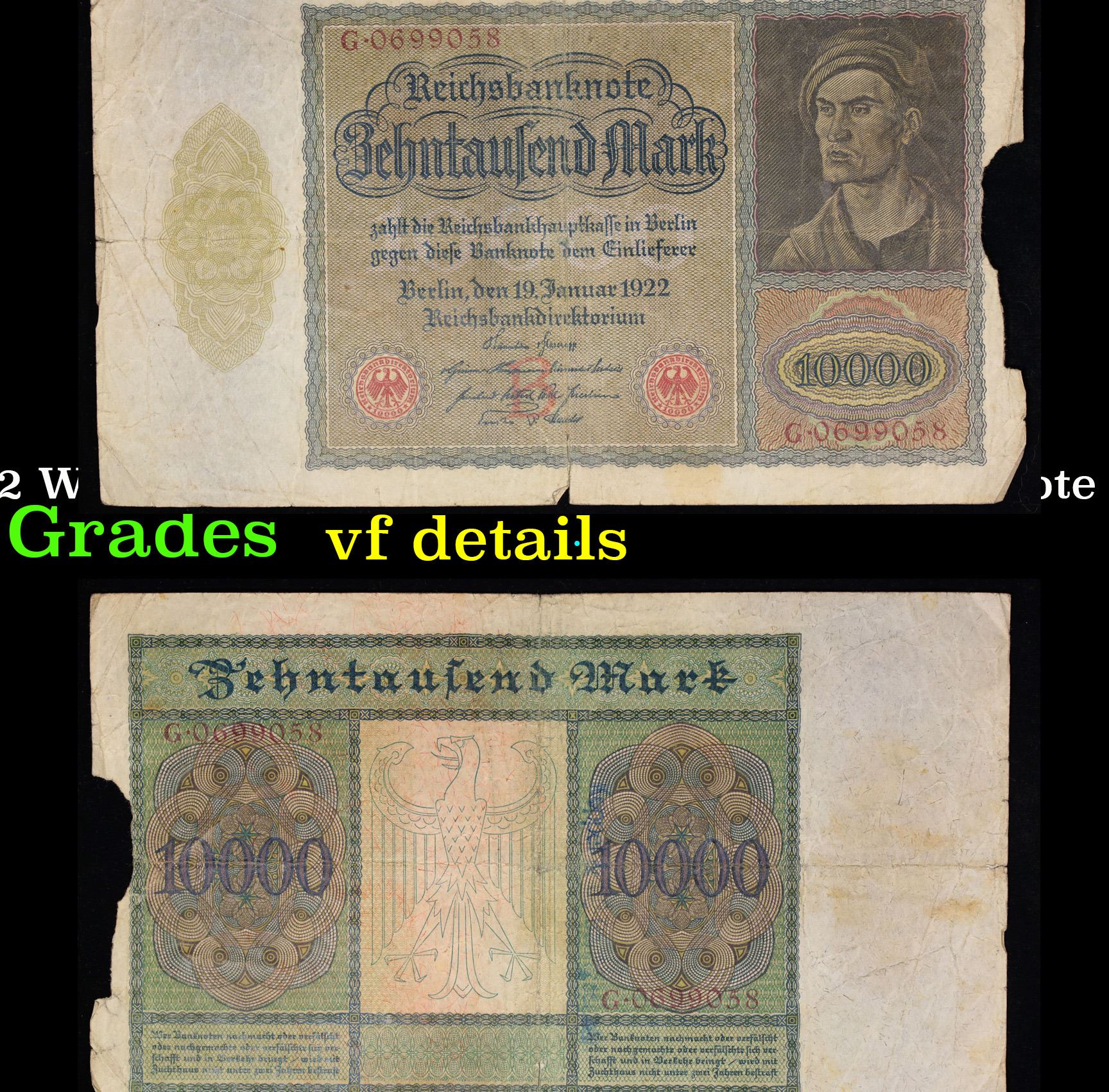 1922 Weimar Germany 10,000 Vampire Mark Note P# 70 Grades vf details. Among the many bills issued during the hyperinflation crisis in the post-WWI German Weimar Republic, the "Vampire Note" is a particular standout. It is known as the Vampire Note because when the note's engraver (identity unknown) adapted a portrait by famous German Renaissance painter Albrecht Durer for the note, he made an odd alteration where the neck of the figure looks like a Vampire when the bill is rotated 90 degrees. It takes some imagination to see, but was intentional and meant to represent the anti-French sentiment in WWI Germany -- France was considered to be "sucking the life out of" the country following the signing of the Treaty of Versailles. The Reichsbank noticed this alteration, but did not change it, printing several varieties of the bill with the design and giving credence to the popular anti-French sentiment. There are three varieties, Pick # 70 and 71 differing in the reverse design, and Pick # 72 being a smaller version of Pick # 71.