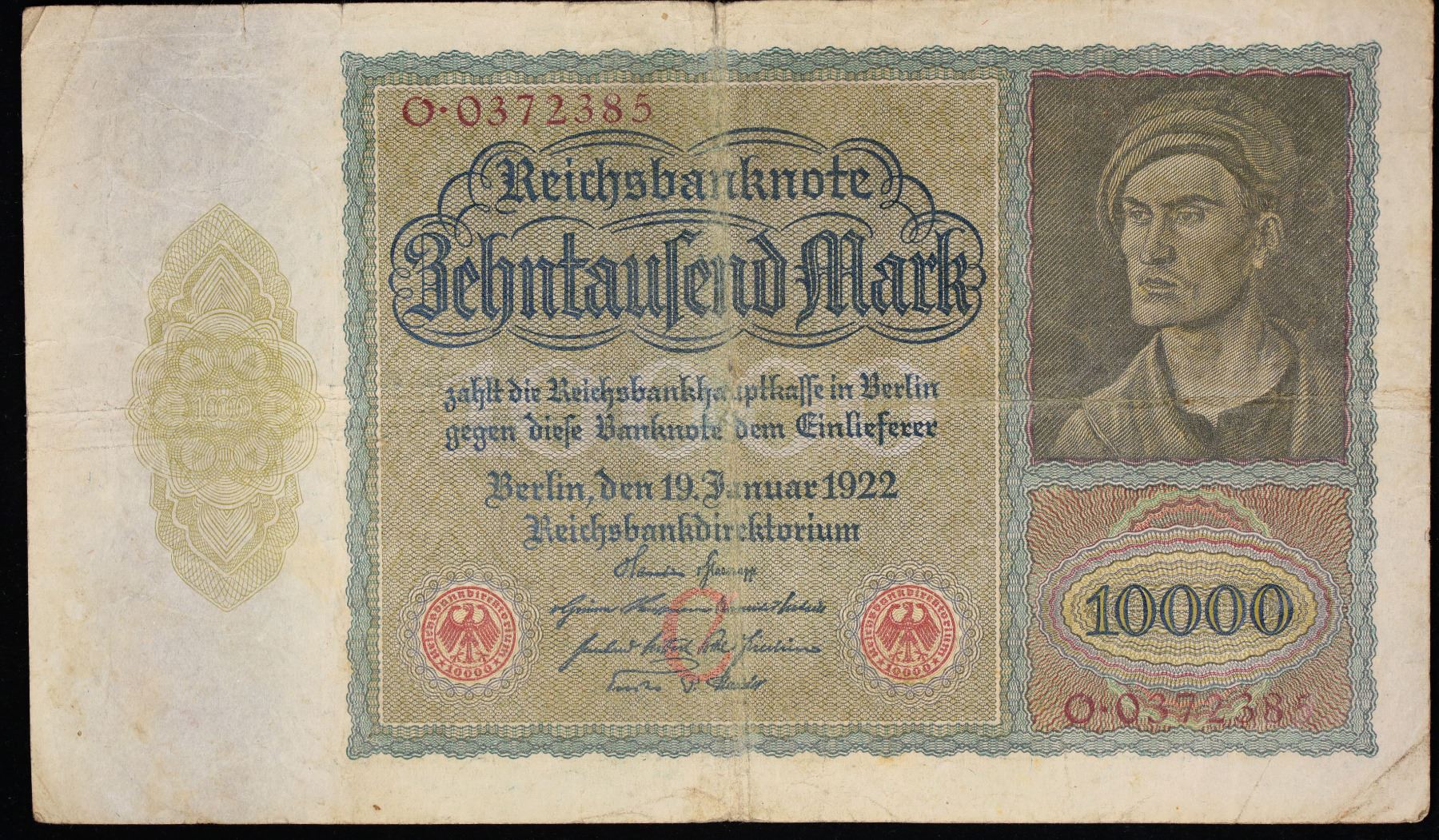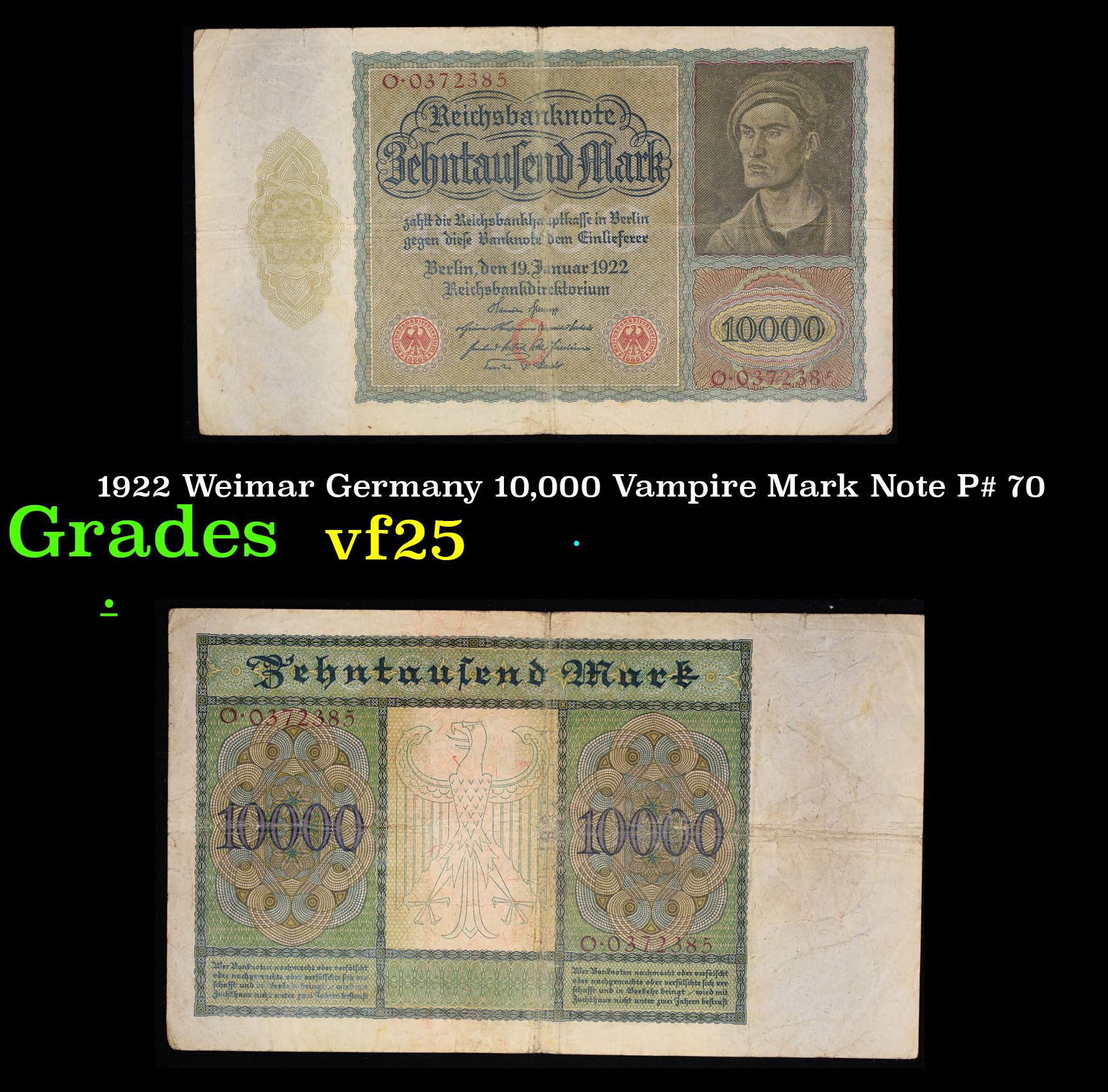 1922 Weimar Germany 10,000 Vampire Mark Note P# 70 Grades vf+. Among the many bills issued during the hyperinflation crisis in the post-WWI German Weimar Republic, the "Vampire Note" is a particular standout. It is known as the Vampire Note because when the note's engraver (identity unknown) adapted a portrait by famous German Renaissance painter Albrecht Durer for the note, he made an odd alteration where the neck of the figure looks like a Vampire when the bill is rotated 90 degrees. It takes some imagination to see, but was intentional and meant to represent the anti-French sentiment in WWI Germany -- France was considered to be "sucking the life out of" the country following the signing of the Treaty of Versailles. The Reichsbank noticed this alteration, but did not change it, printing several varieties of the bill with the design and giving credence to the popular anti-French sentiment. There are three varieties, Pick # 70 and 71 differing in the reverse design, and Pick # 72 being a smaller version of Pick # 71.