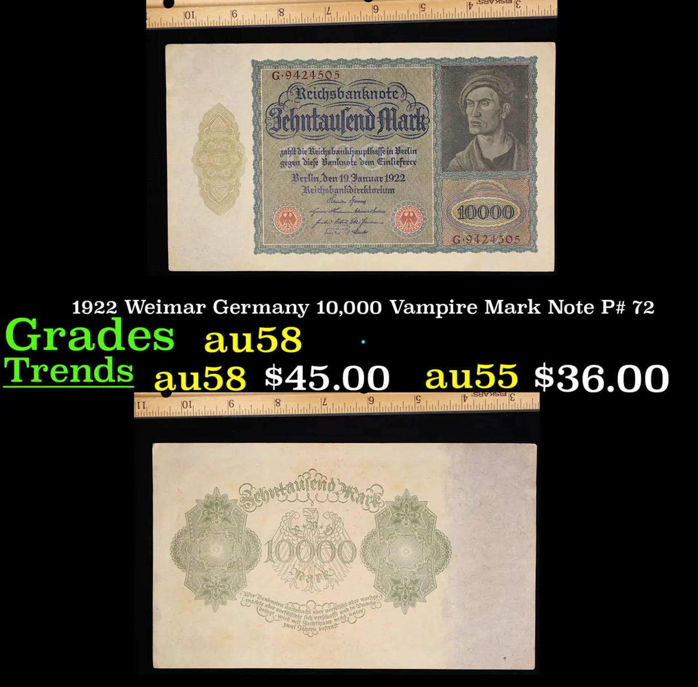 1922 Weimar Germany 10,000 Vampire Mark Note P# 72 Grades Choice AU/BU Slider. Among the many bills issued during the hyperinflation crisis in the post-WWI German Weimar Republic, the "Vampire Note" is a particular standout. It is known as the Vampire Note because when the note's engraver (identity unknown) adapted a portrait by famous German Renaissance painter Albrecht Durer for the note, he made an odd alteration where the neck of the figure looks like a Vampire when the bill is rotated 90 degrees. It takes some imagination to see, but was intentional and meant to represent the anti-French sentiment in WWI Germany -- France was considered to be "sucking the life out of" the country following the signing of the Treaty of Versailles. The Reichsbank noticed this alteration, but did not change it, printing several varieties of the bill with the design and giving credence to the popular anti-French sentiment. There are three varieties, Pick # 70 and 71 differing in the reverse design, and Pick # 72 being a smaller version of Pick # 71.