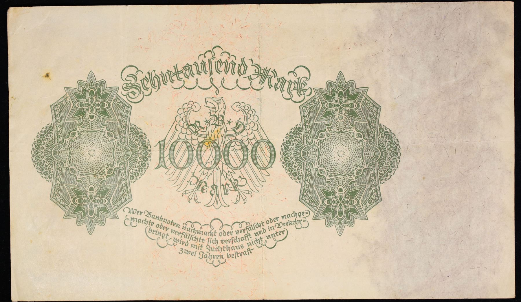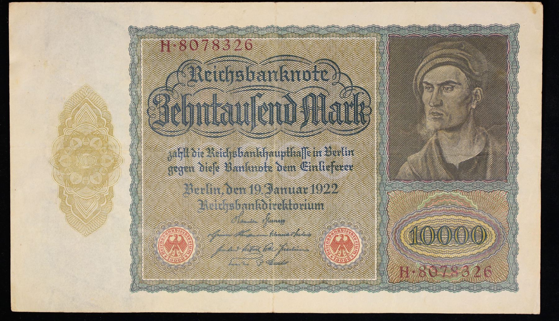 1922 Weimar Germany 10,000 Vampire Mark Note P# 72 Grades Select AU. Among the many bills issued during the hyperinflation crisis in the post-WWI German Weimar Republic, the "Vampire Note" is a particular standout. It is known as the Vampire Note because when the note's engraver (identity unknown) adapted a portrait by famous German Renaissance painter Albrecht Durer for the note, he made an odd alteration where the neck of the figure looks like a Vampire when the bill is rotated 90 degrees. It takes some imagination to see, but was intentional and meant to represent the anti-French sentiment in WWI Germany -- France was considered to be "sucking the life out of" the country following the signing of the Treaty of Versailles. The Reichsbank noticed this alteration, but did not change it, printing several varieties of the bill with the design and giving credence to the popular anti-French sentiment. There are three varieties, Pick # 70 and 71 differing in the reverse design, and Pick # 72 being a smaller version of Pick # 71.