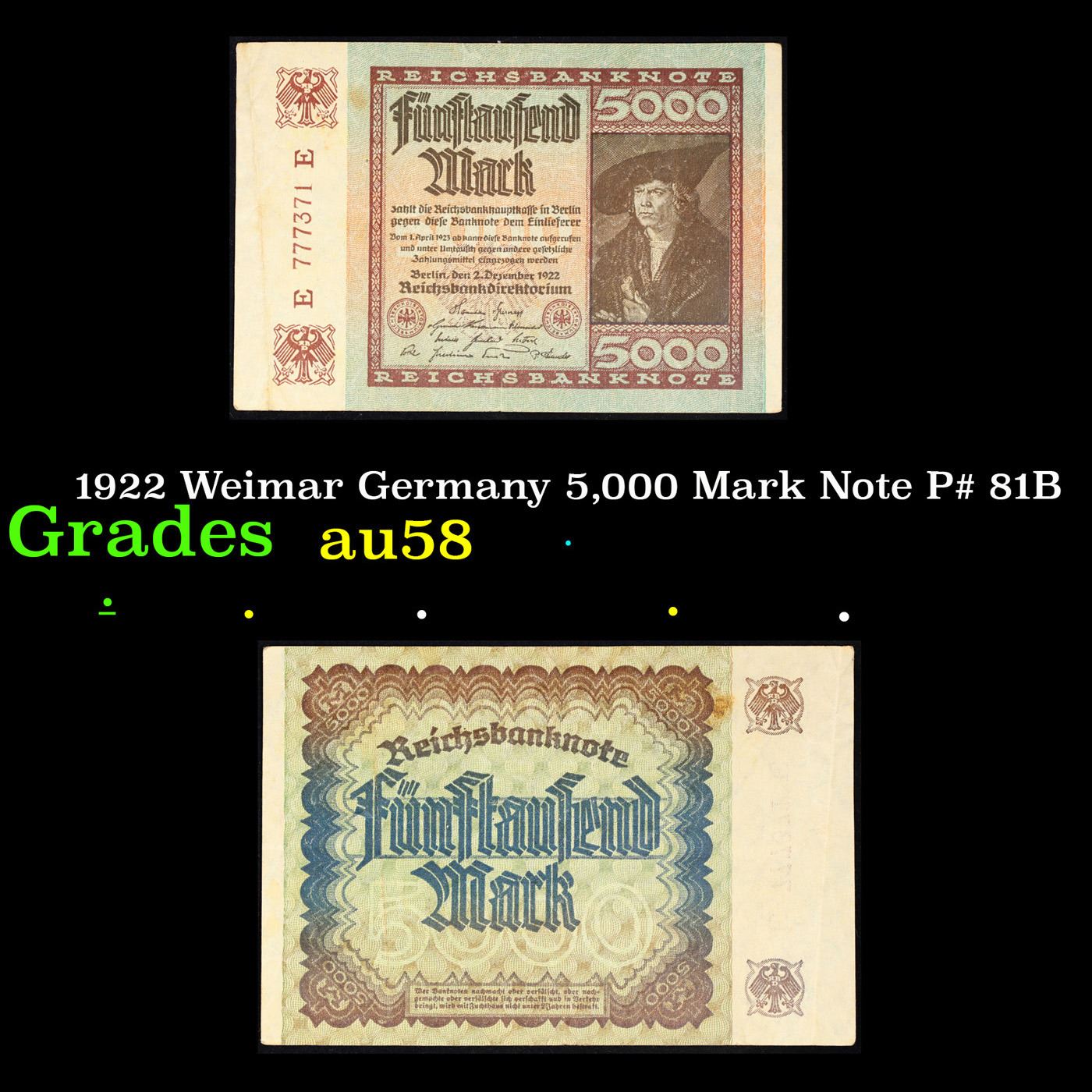 1922 Weimar Germany 5,000 Mark Note P# 81B Grades Choice AU/BU Slider