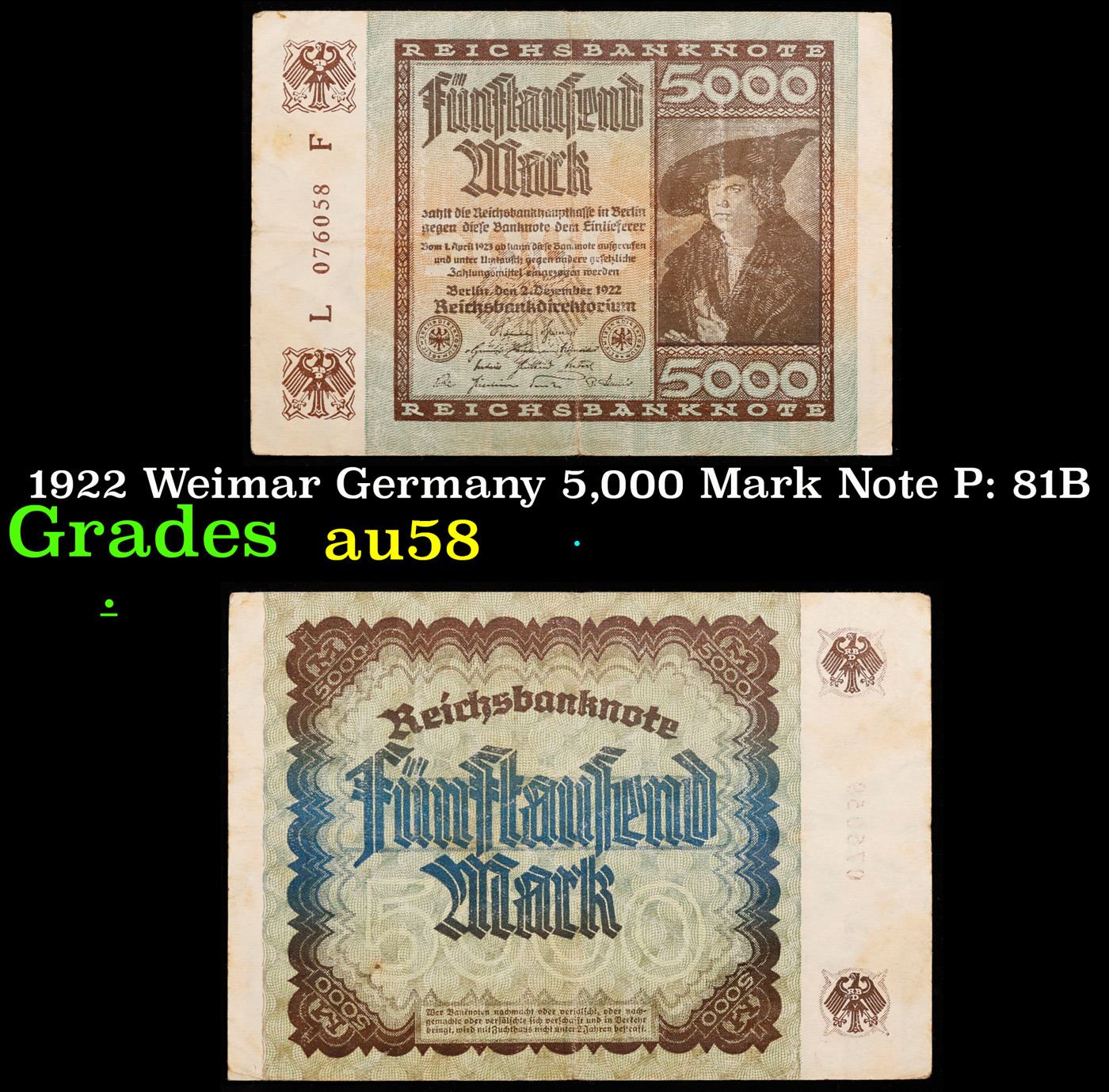 1922 Weimar Germany 5,000 Mark Note P: 81B Grades Choice AU/BU Slider.