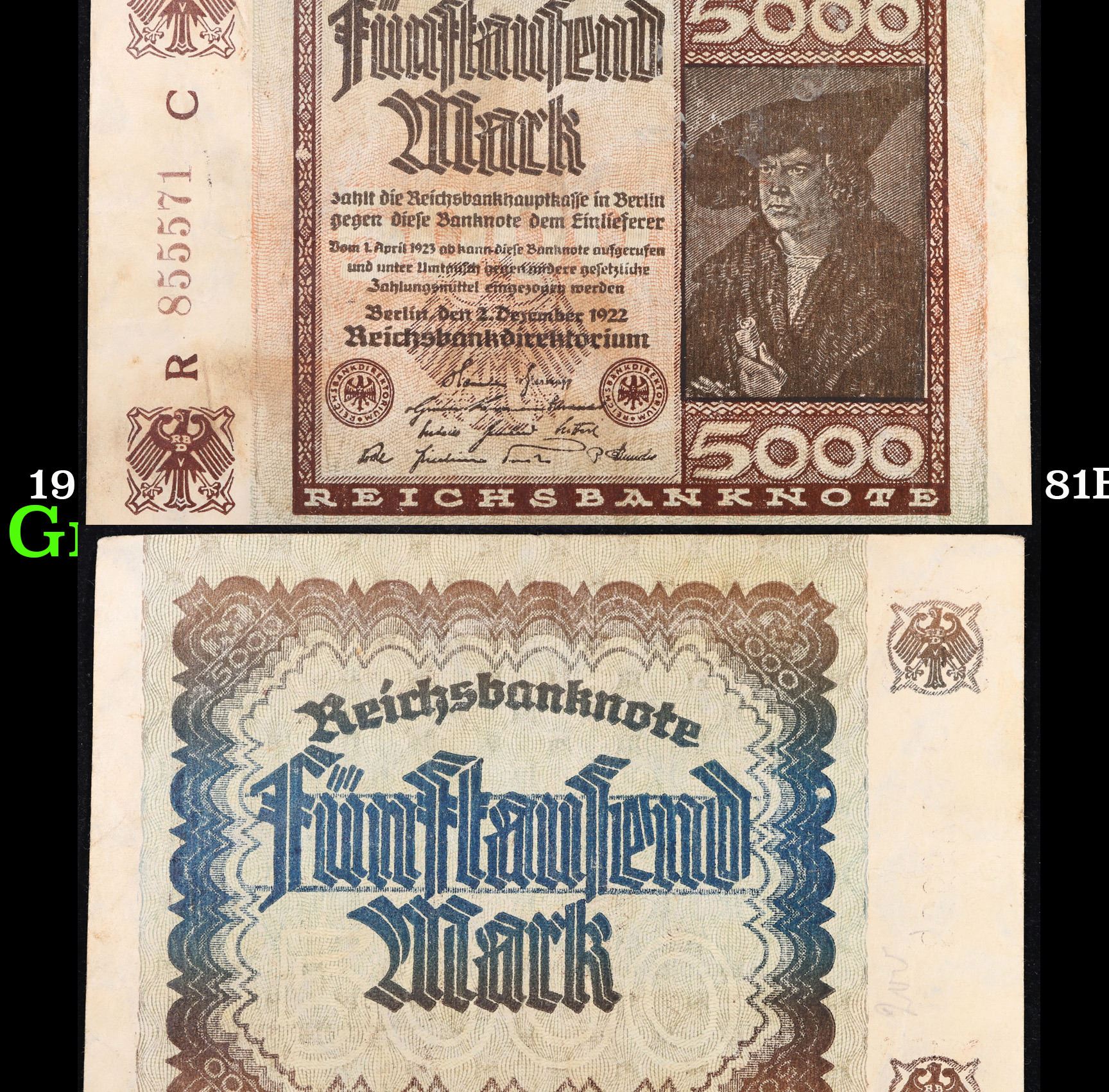 1922 Weimar Germany 5,000 Mark Note P: 81B Grades Choice AU/BU Slider