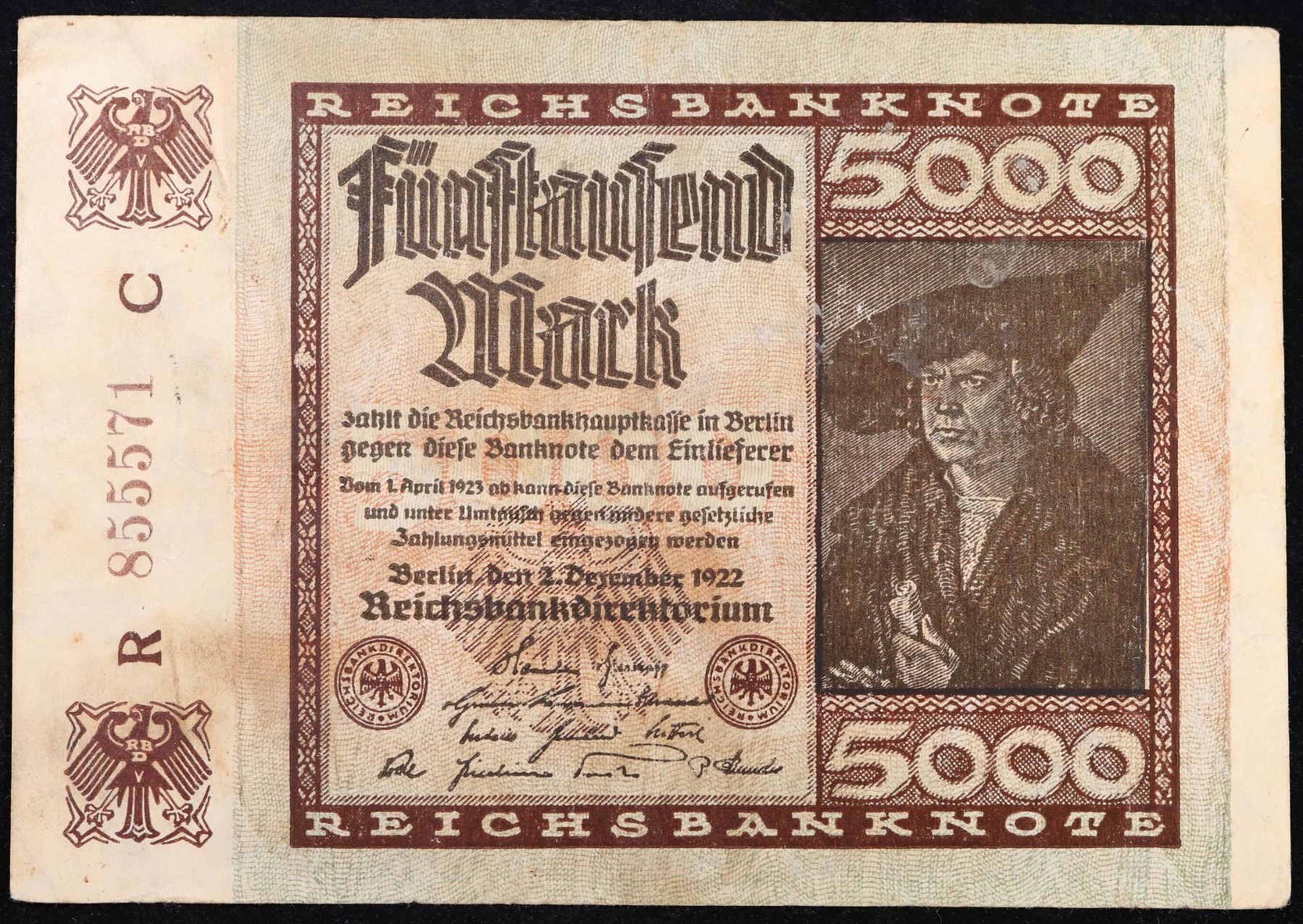 1922 Weimar Germany 5,000 Mark Note P: 81B Grades Choice AU/BU Slider.