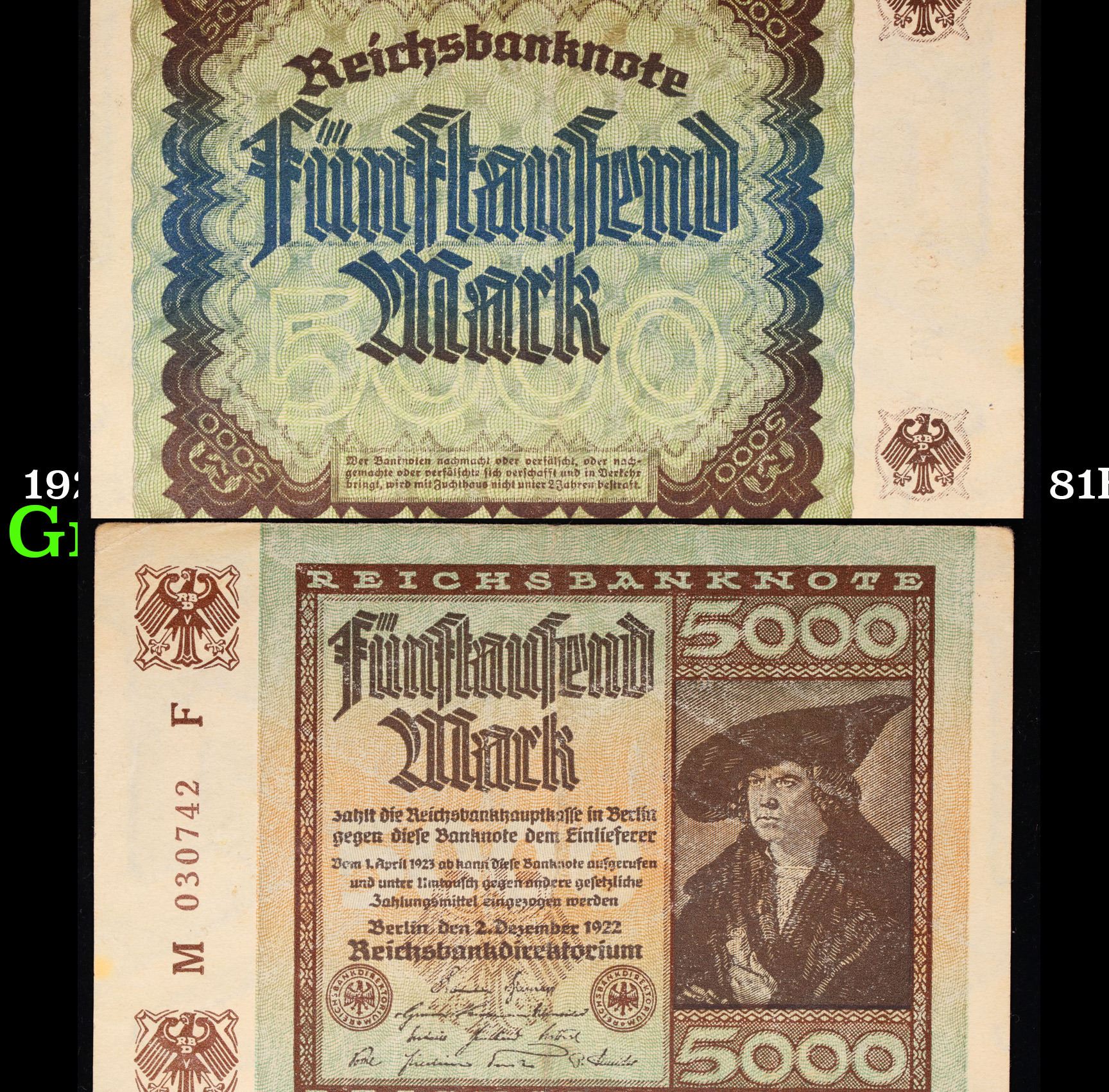 1922 Weimar Germany 5,000 Mark Note P# 81B Grades Choice AU/BU Slider