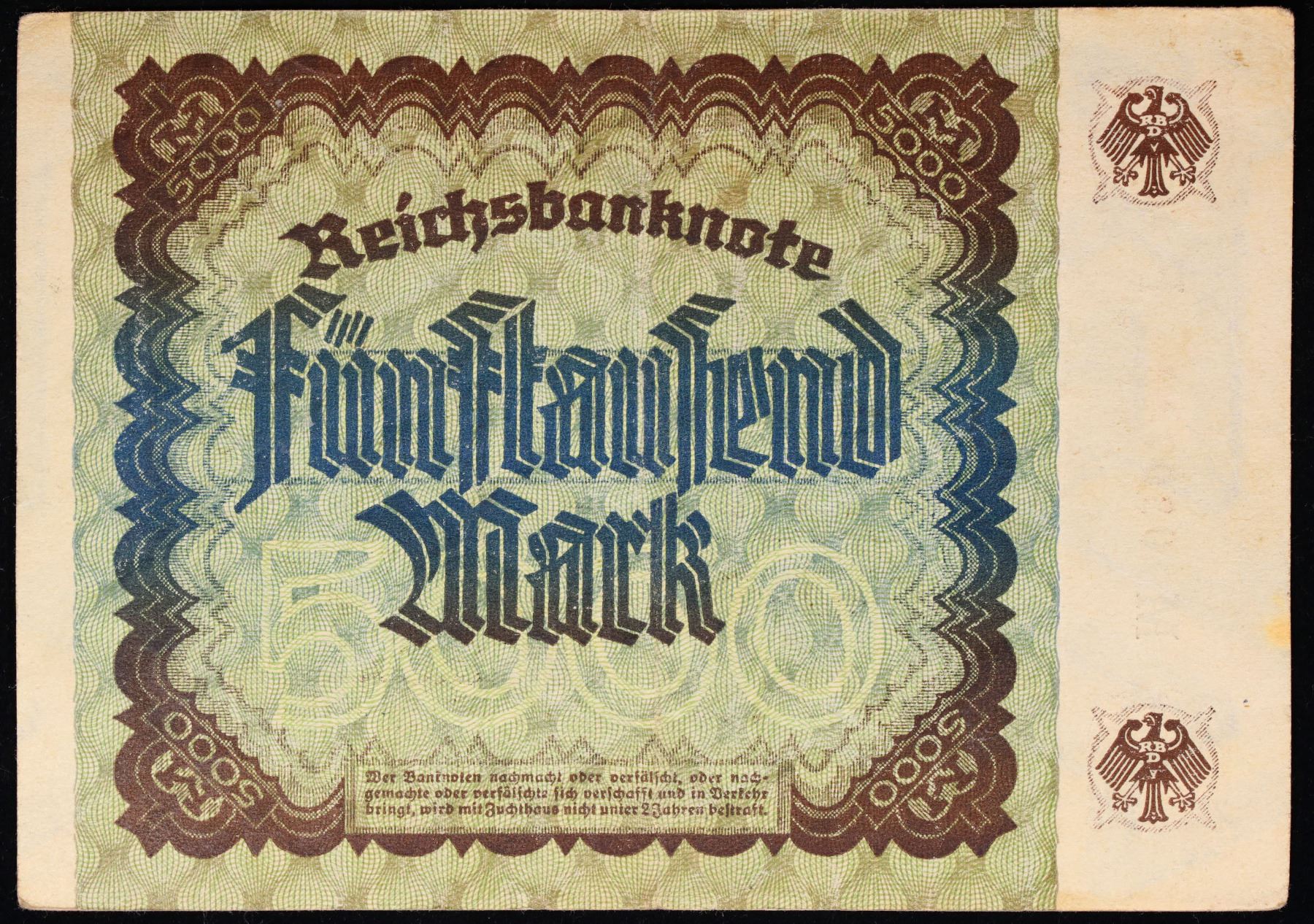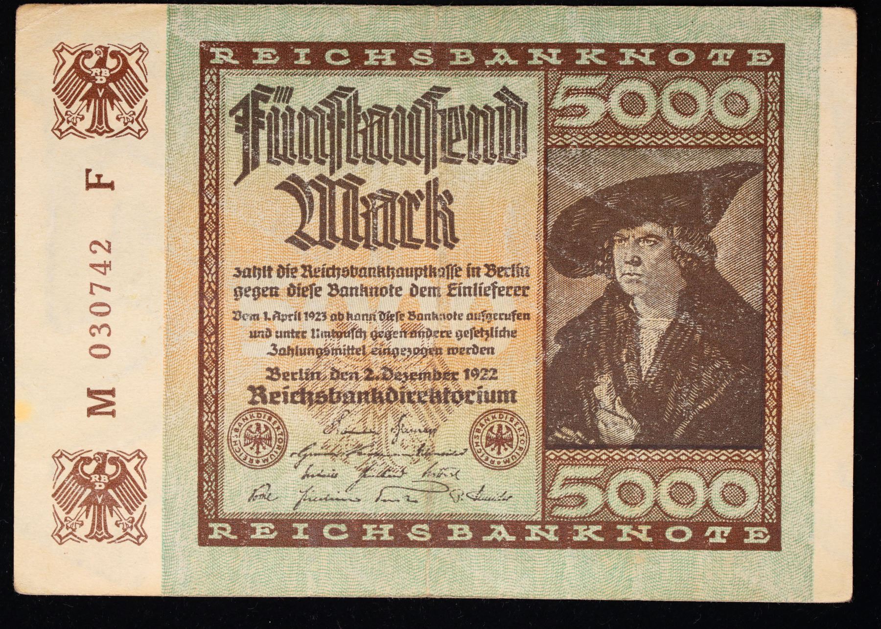 1922 Weimar Germany 5,000 Mark Note P# 81B Grades Choice AU/BU Slider. In the early 1920s, post-WWI Germany saw its economy spiraling out of control. Hyperinflation started directly after the war in 1918, but truly took over the Weimar Republic from 1921 to 1923. The value of the Mark declined incredibly rapidly. 1 USD was equal to 50 German Marks at the beginning of 1920. Toward the end of 1923, 1 USD was equal to over 4,200,000,000,000 German Marks. At times, denominations of the Mark became less valuable than the paper and labor to print it almost immediately after printing. Thus, denominations of the Mark notes became incredibly large, ending up in the tens of trillions.