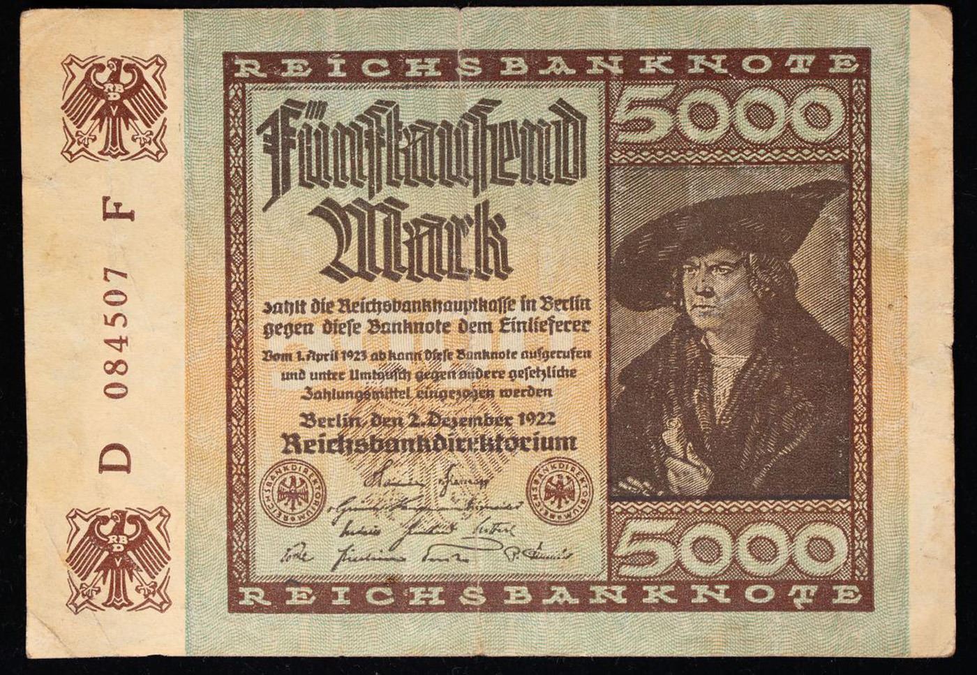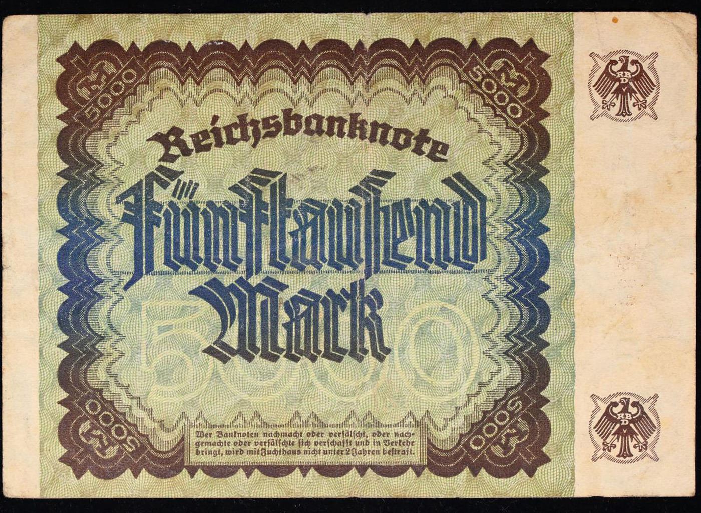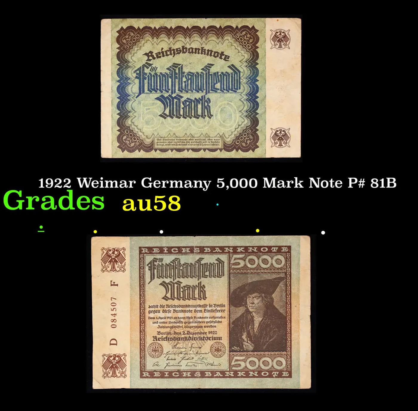 1922 Weimar Germany 5,000 Mark Note P# 81B Grades Choice AU/BU Slider. In the early 1920s, post-WWI Germany saw its economy spiraling out of control. Hyperinflation started directly after the war in 1918, but truly took over the Weimar Republic from 1921 to 1923. The value of the Mark declined incredibly rapidly. 1 USD was equal to 50 German Marks at the beginning of 1920. Toward the end of 1923, 1 USD was equal to over 4,200,000,000,000 German Marks. At times, denominations of the Mark became less valuable than the paper and labor to print it almost immediately after printing. Thus, denominations of the Mark notes became incredibly large, ending up in the tens of trillions.