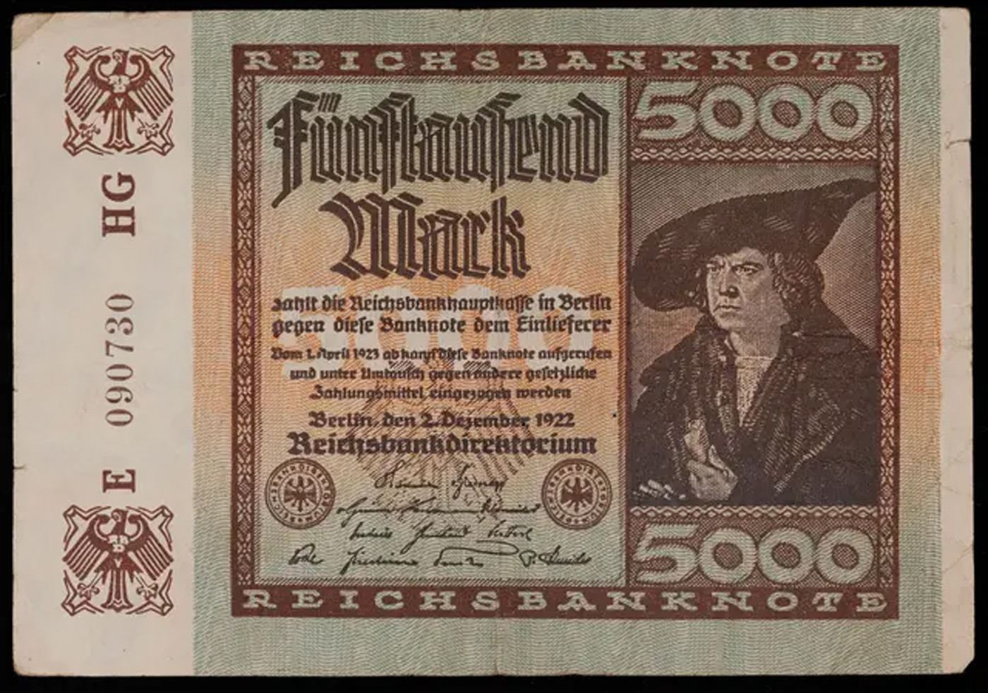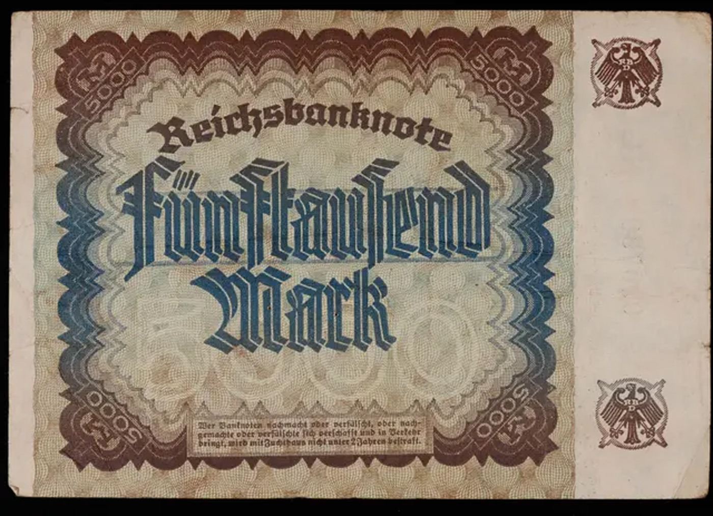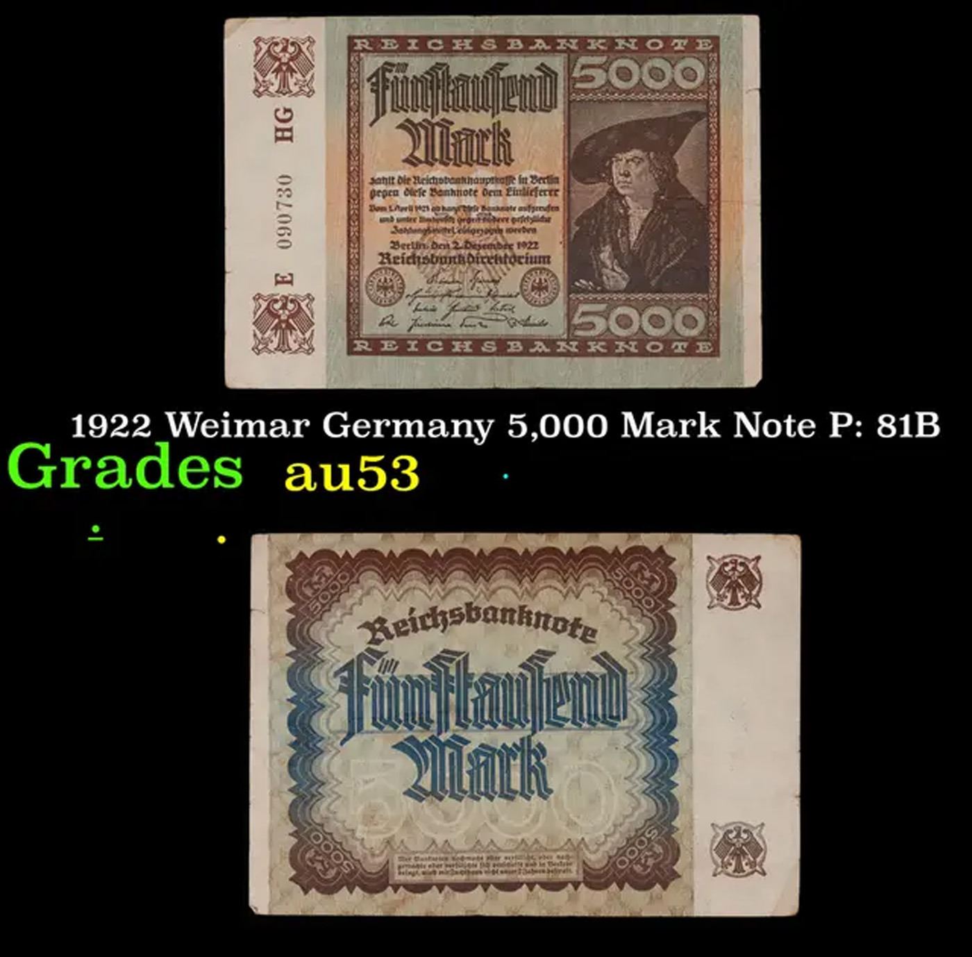 1922 Weimar Germany 5,000 Mark Note P: 81B Grades Select AU. In the early 1920s, post-WWI Germany saw its economy spiraling out of control. Hyperinflation started directly after the war in 1918, but truly took over the Weimar Republic from 1921 to 1923. The value of the Mark declined incredibly rapidly. 1 USD was equal to 50 German Marks at the beginning of 1920. Toward the end of 1923, 1 USD was equal to over 4,200,000,000,000 German Marks. At times, denominations of the Mark became less valuable than the paper and labor to print it almost immediately after printing. Thus, denominations of the Mark notes became incredibly large, ending up in the tens of trillions.