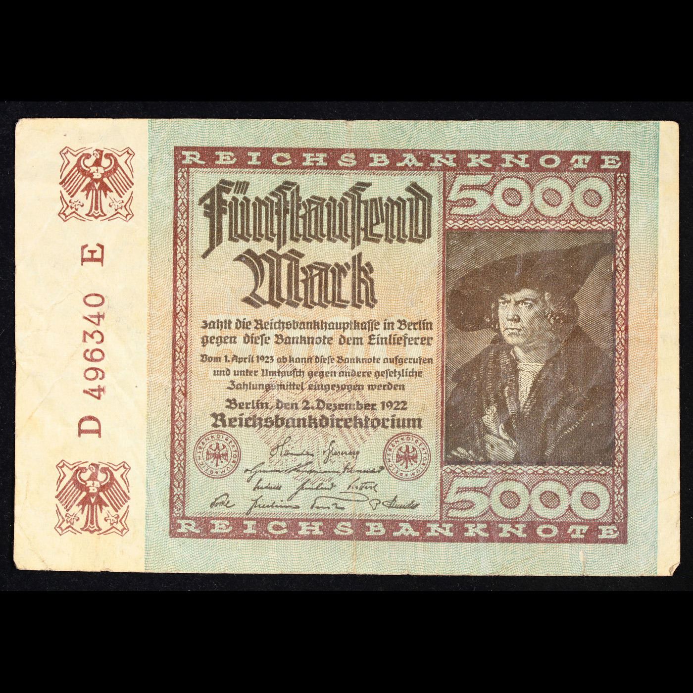 1922 Weimar Germany 5,000 Mark Note P# 81B Grades vf+.