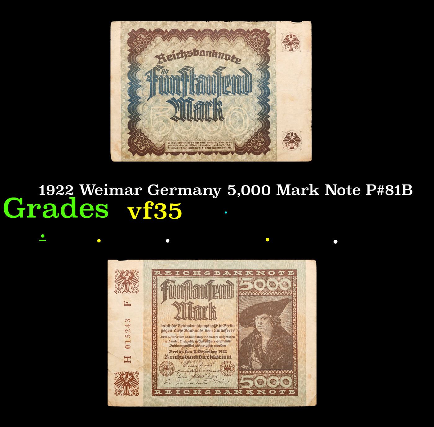 1922 Weimar Germany 5,000 Mark Note P#81B Grades vf++