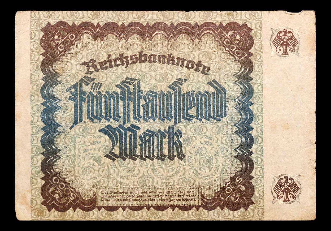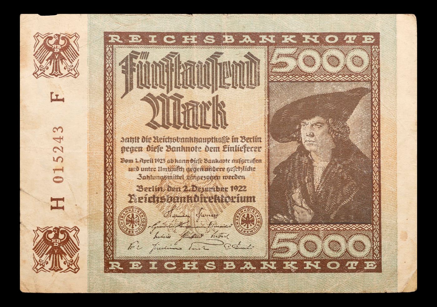 1922 Weimar Germany 5,000 Mark Note P#81B Grades vf++. In the early 1920s, post-WWI Germany saw its economy spiraling out of control. Hyperinflation started directly after the war in 1918, but truly took over the Weimar Republic from 1921 to 1923. The value of the Mark declined incredibly rapidly. 1 USD was equal to 50 German Marks at the beginning of 1920. Toward the end of 1923, 1 USD was equal to over 4,200,000,000,000 German Marks. At times, denominations of the Mark became less valuable than the paper and labor to print it almost immediately after printing. Thus, denominations of the Mark notes became incredibly large, ending up in the tens of trillions.