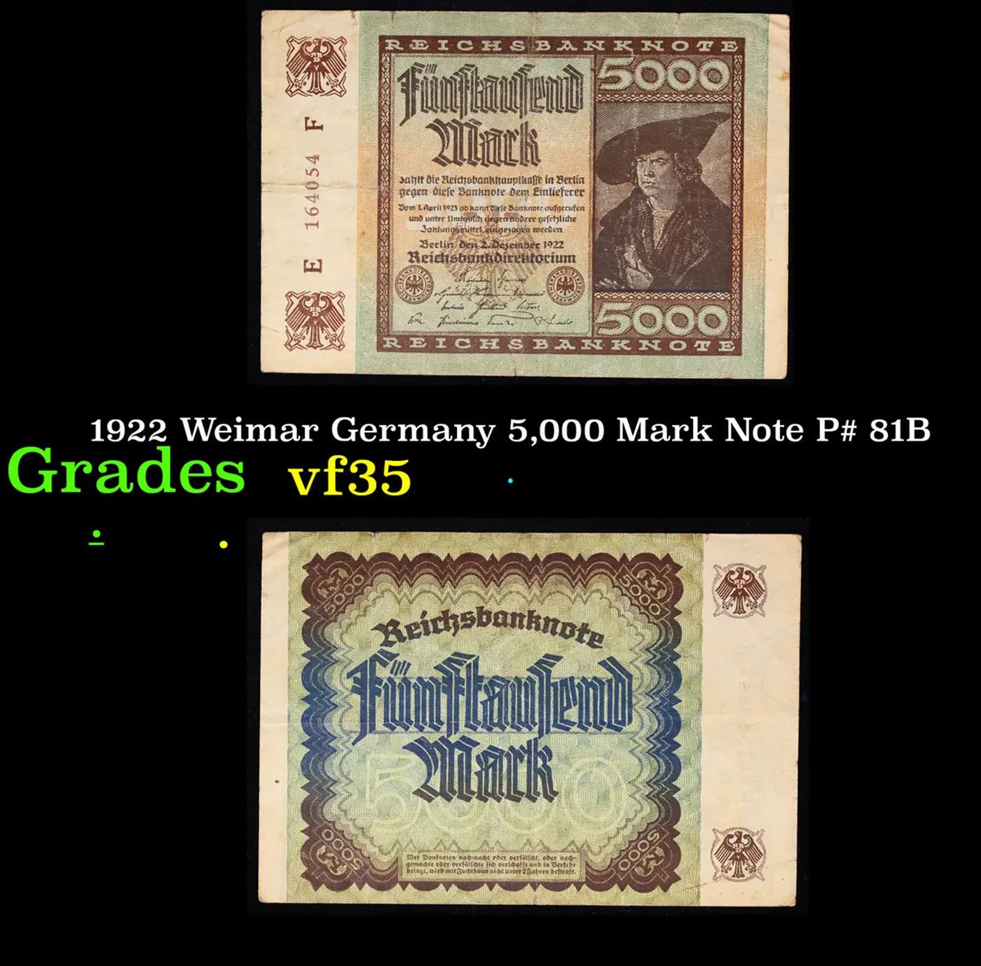 1922 Weimar Germany 5,000 Mark Note P# 81B Grades vf++. In the early 1920s, post-WWI Germany saw its economy spiraling out of control. Hyperinflation started directly after the war in 1918, but truly took over the Weimar Republic from 1921 to 1923. The value of the Mark declined incredibly rapidly. 1 USD was equal to 50 German Marks at the beginning of 1920. Toward the end of 1923, 1 USD was equal to over 4,200,000,000,000 German Marks. At times, denominations of the Mark became less valuable than the paper and labor to print it almost immediately after printing. Thus, denominations of the Mark notes became incredibly large, ending up in the tens of trillions.