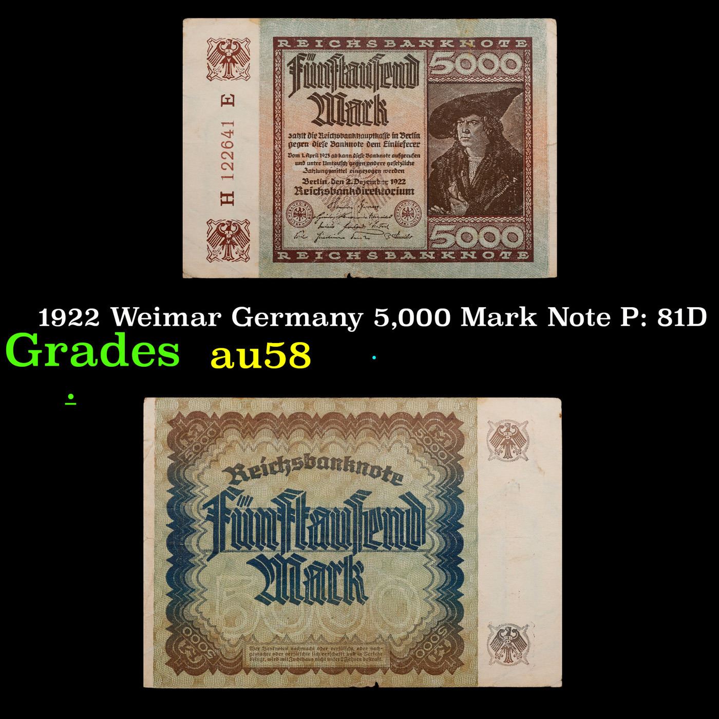 1922 Weimar Germany 5,000 Mark Note P: 81D Grades Choice AU/BU Slider