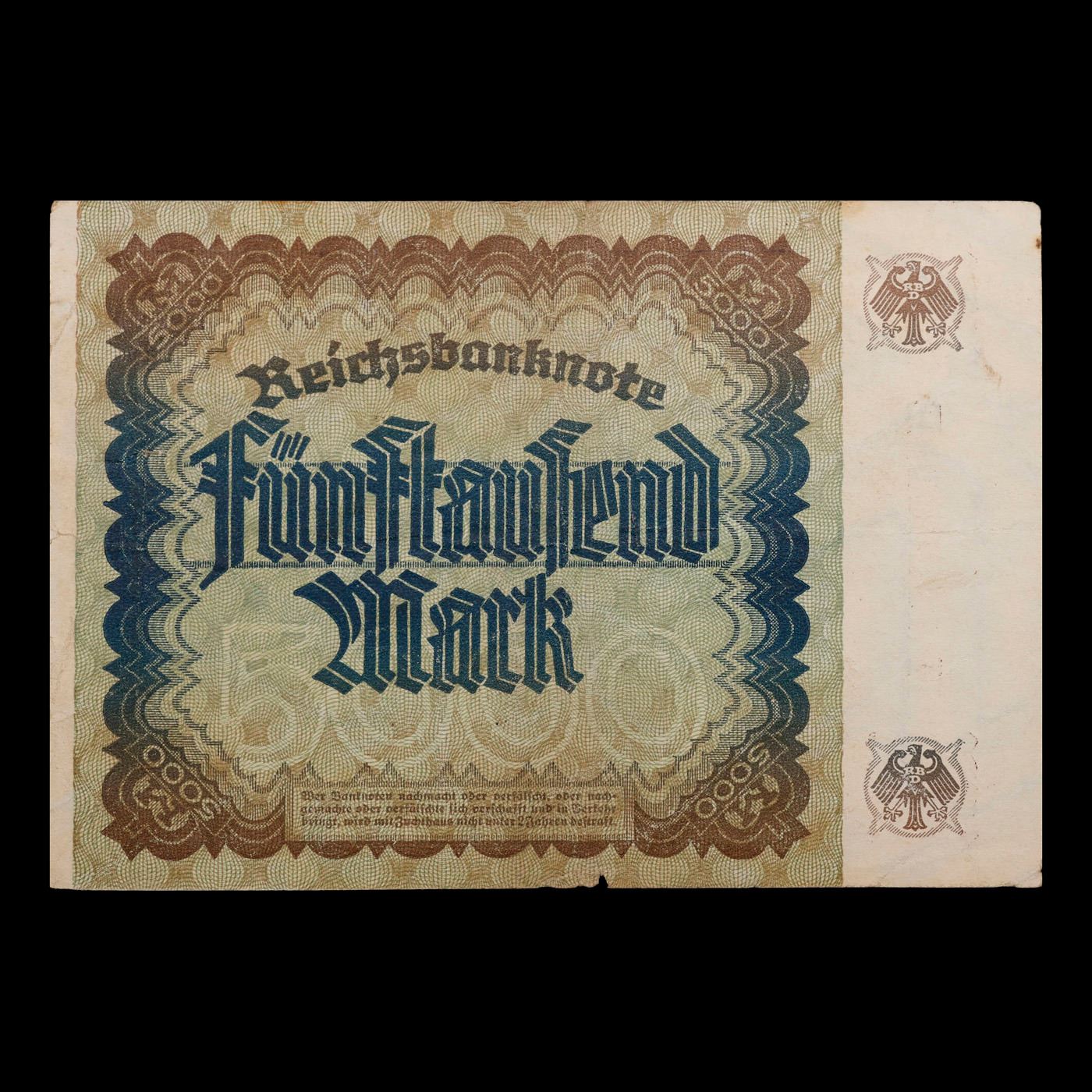 1922 Weimar Germany 5,000 Mark Note P: 81D Grades Choice AU/BU Slider. In the early 1920s, post-WWI Germany saw its economy spiraling out of control. Hyperinflation started directly after the war in 1918, but truly took over the Weimar Republic from 1921 to 1923. The value of the Mark declined incredibly rapidly. 1 USD was equal to 50 German Marks at the beginning of 1920. Toward the end of 1923, 1 USD was equal to over 4,200,000,000,000 German Marks. At times, denominations of the Mark became less valuable than the paper and labor to print it almost immediately after printing. Thus, denominations of the Mark notes became incredibly large, ending up in the tens of trillions.