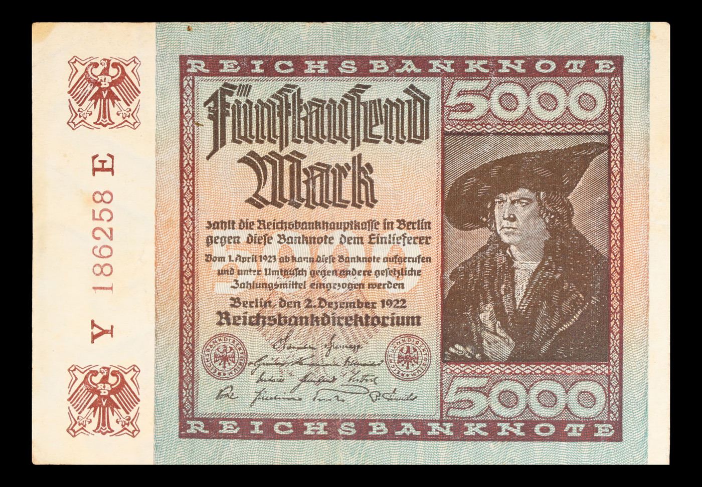 1922 Weimar Germany 5,000 Mark Note P: 81D Grades Choice AU/BU Slider. In the early 1920s, post-WWI Germany saw its economy spiraling out of control. Hyperinflation started directly after the war in 1918, but truly took over the Weimar Republic from 1921 to 1923. The value of the Mark declined incredibly rapidly. 1 USD was equal to 50 German Marks at the beginning of 1920. Toward the end of 1923, 1 USD was equal to over 4,200,000,000,000 German Marks. At times, denominations of the Mark became less valuable than the paper and labor to print it almost immediately after printing. Thus, denominations of the Mark notes became incredibly large, ending up in the tens of trillions.