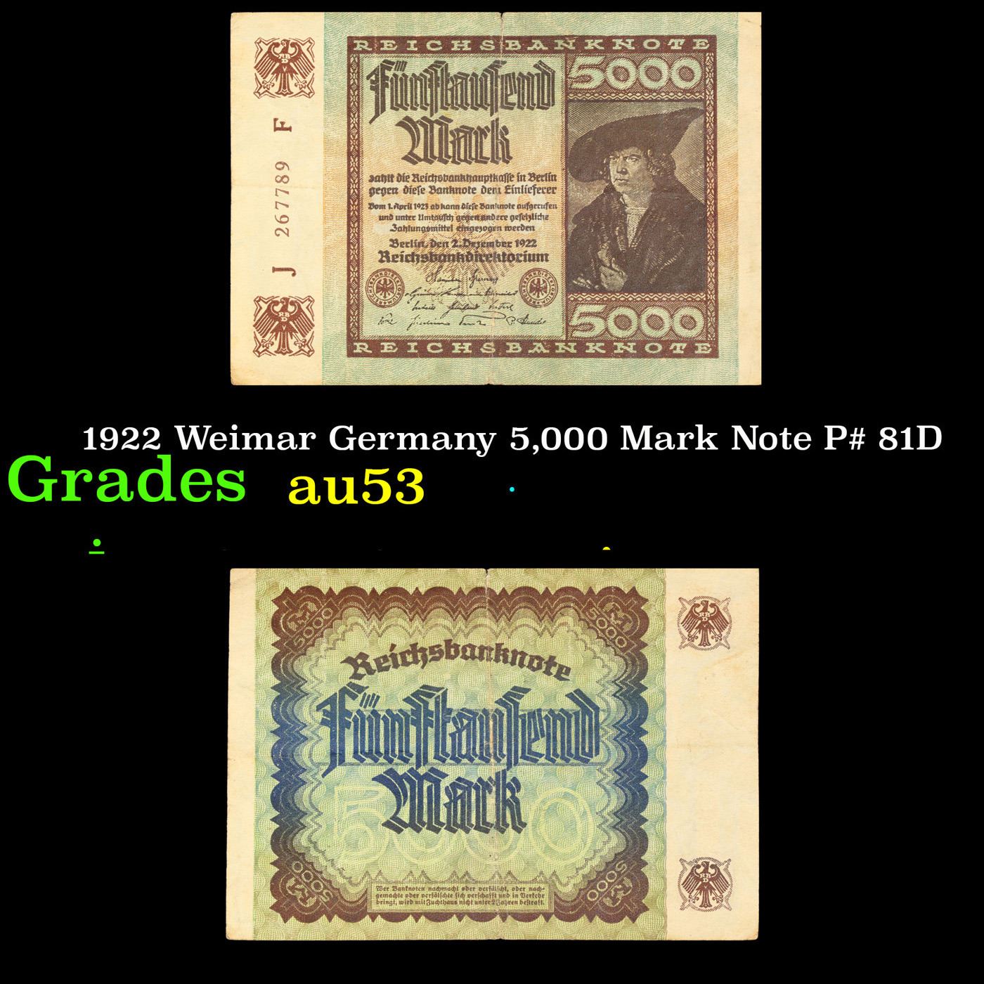 1922 Weimar Germany 5,000 Mark Note P# 81D Grades Select AU