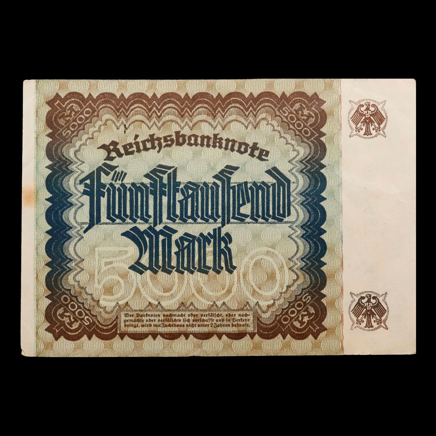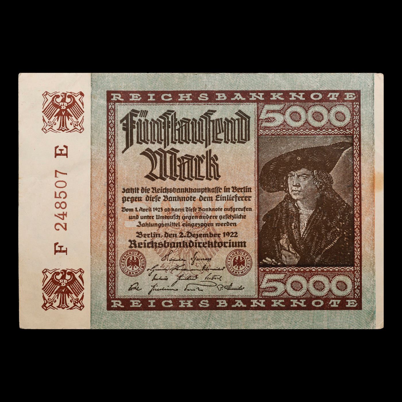 1922 Weimar Germany 5,000 Mark Note P: 81D Grades Select AU. In the early 1920s, post-WWI Germany saw its economy spiraling out of control. Hyperinflation started directly after the war in 1918, but truly took over the Weimar Republic from 1921 to 1923. The value of the Mark declined incredibly rapidly. 1 USD was equal to 50 German Marks at the beginning of 1920. Toward the end of 1923, 1 USD was equal to over 4,200,000,000,000 German Marks. At times, denominations of the Mark became less valuable than the paper and labor to print it almost immediately after printing. Thus, denominations of the Mark notes became incredibly large, ending up in the tens of trillions.