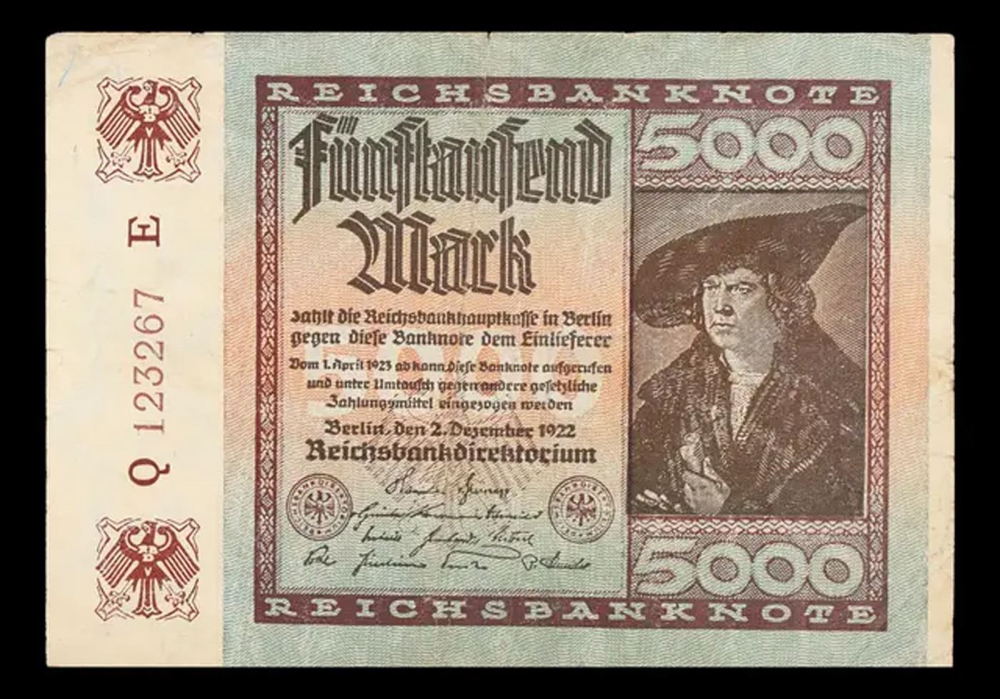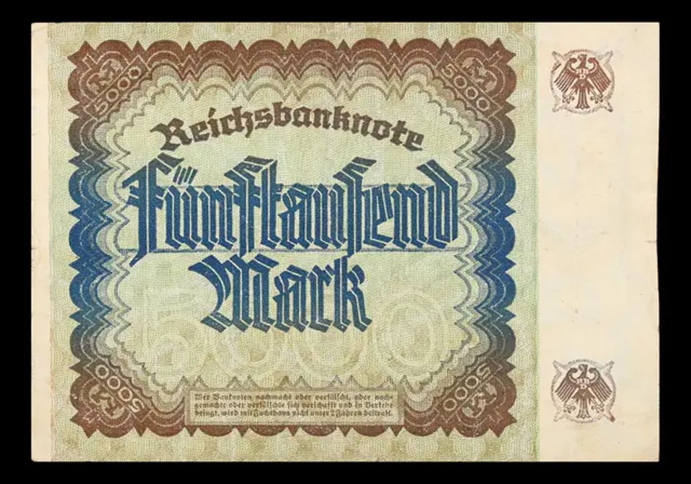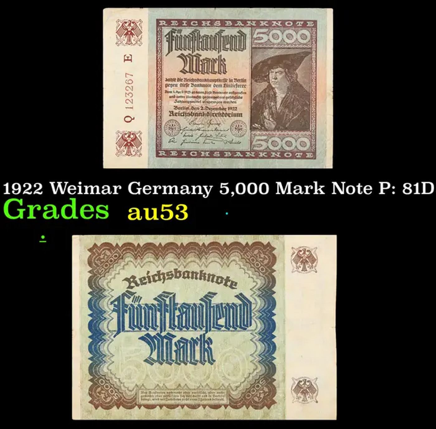 1922 Weimar Germany 5,000 Mark Note P: 81D Grades Select AU. In the early 1920s, post-WWI Germany saw its economy spiraling out of control. Hyperinflation started directly after the war in 1918, but truly took over the Weimar Republic from 1921 to 1923. The value of the Mark declined incredibly rapidly. 1 USD was equal to 50 German Marks at the beginning of 1920. Toward the end of 1923, 1 USD was equal to over 4,200,000,000,000 German Marks. At times, denominations of the Mark became less valuable than the paper and labor to print it almost immediately after printing. Thus, denominations of the Mark notes became incredibly large, ending up in the tens of trillions.