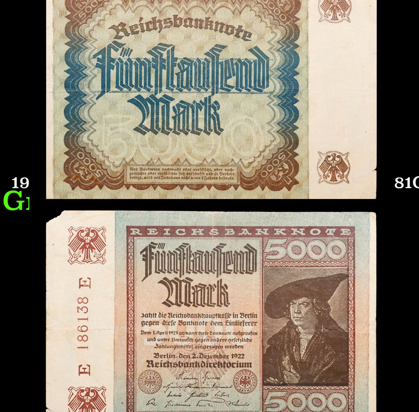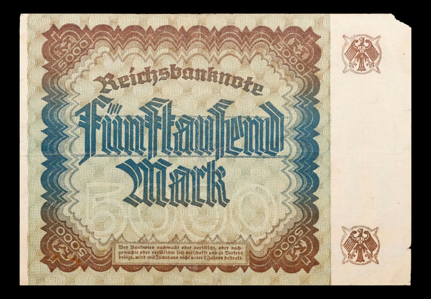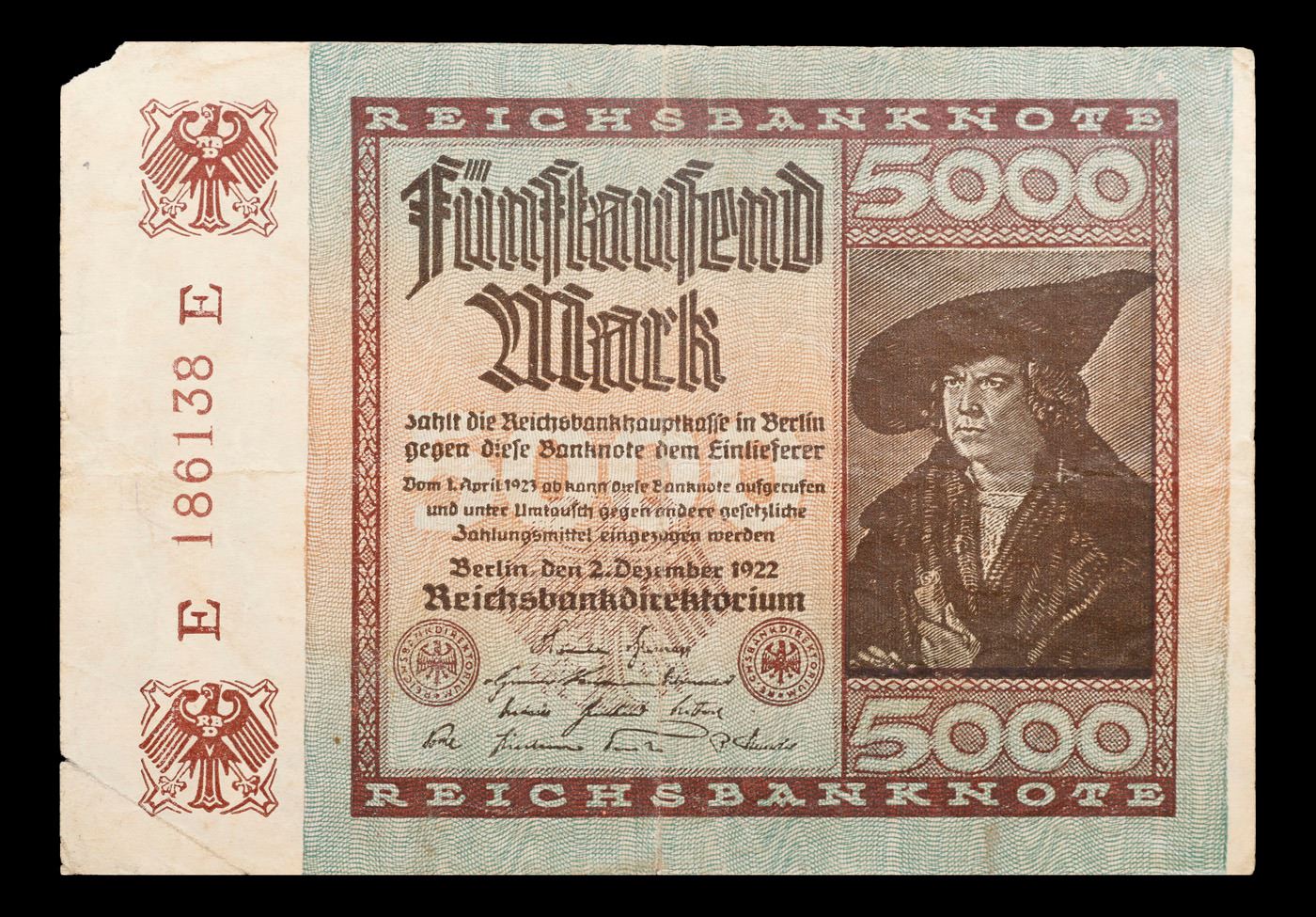 1922 Weimar Germany 5000 Mark Note P# 81C Grades AU Details. In the early 1920s, post-WWI Germany saw its economy spiraling out of control. Hyperinflation started directly after the war in 1918, but truly took over the Weimar Republic from 1921 to 1923. The value of the Mark declined incredibly rapidly. 1 USD was equal to 50 German Marks at the beginning of 1920. Toward the end of 1923, 1 USD was equal to over 4,200,000,000,000 German Marks. At times, denominations of the Mark became less valuable than the paper and labor to print it almost immediately after printing. Thus, denominations of the Mark notes became incredibly large, ending up in the tens of trillions.