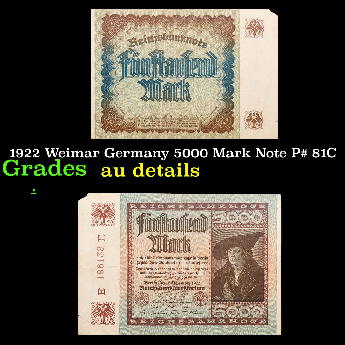 1922 Weimar Germany 5000 Mark Note P# 81C Grades AU Details. In the early 1920s, post-WWI Germany saw its economy spiraling out of control. Hyperinflation started directly after the war in 1918, but truly took over the Weimar Republic from 1921 to 1923. The value of the Mark declined incredibly rapidly. 1 USD was equal to 50 German Marks at the beginning of 1920. Toward the end of 1923, 1 USD was equal to over 4,200,000,000,000 German Marks. At times, denominations of the Mark became less valuable than the paper and labor to print it almost immediately after printing. Thus, denominations of the Mark notes became incredibly large, ending up in the tens of trillions.