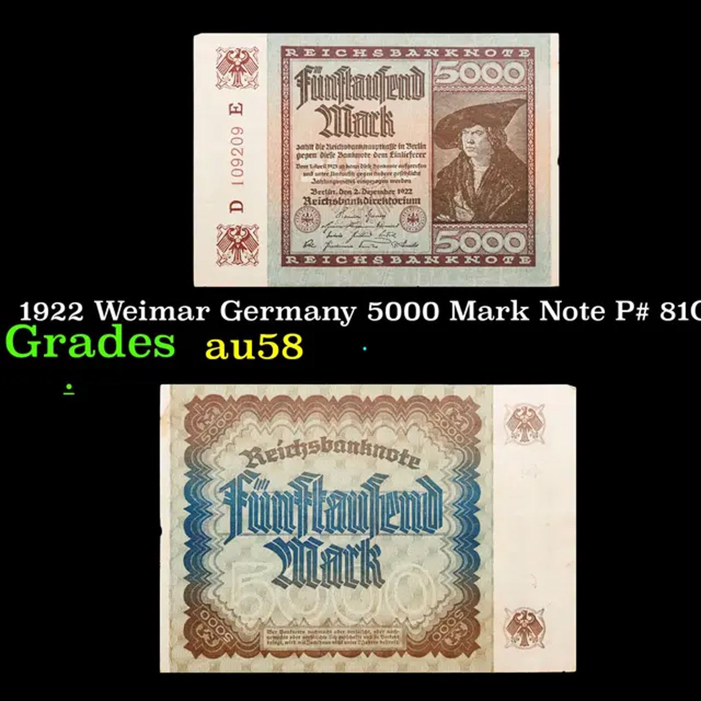 1922 Weimar Germany 5000 Mark Note P# 81C Grades Choice AU/BU Slider. In the early 1920s, post-WWI Germany saw its economy spiraling out of control. Hyperinflation started directly after the war in 1918, but truly took over the Weimar Republic from 1921 to 1923. The value of the Mark declined incredibly rapidly. 1 USD was equal to 50 German Marks at the beginning of 1920. Toward the end of 1923, 1 USD was equal to over 4,200,000,000,000 German Marks. At times, denominations of the Mark became less valuable than the paper and labor to print it almost immediately after printing. Thus, denominations of the Mark notes became incredibly large, ending up in the tens of trillions.