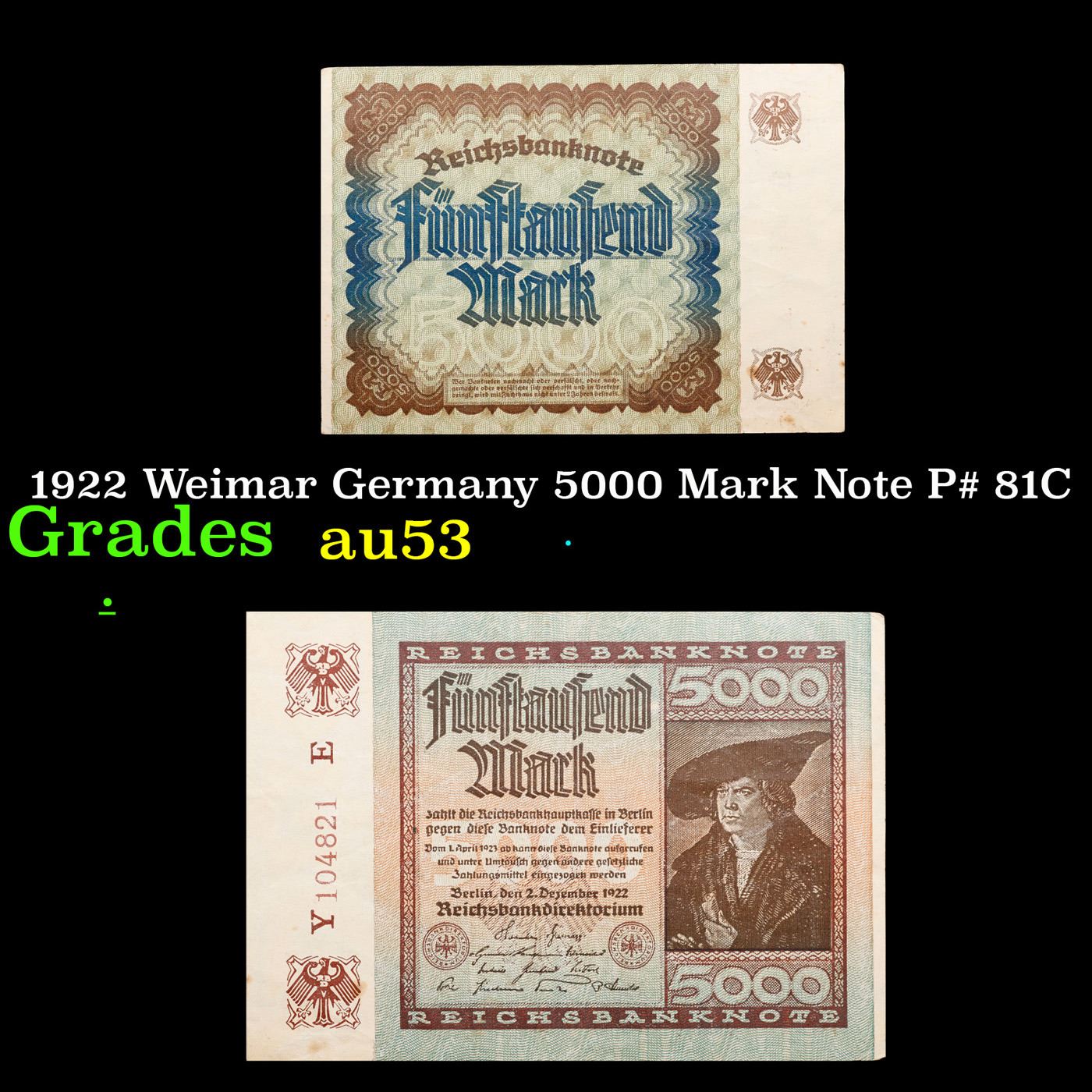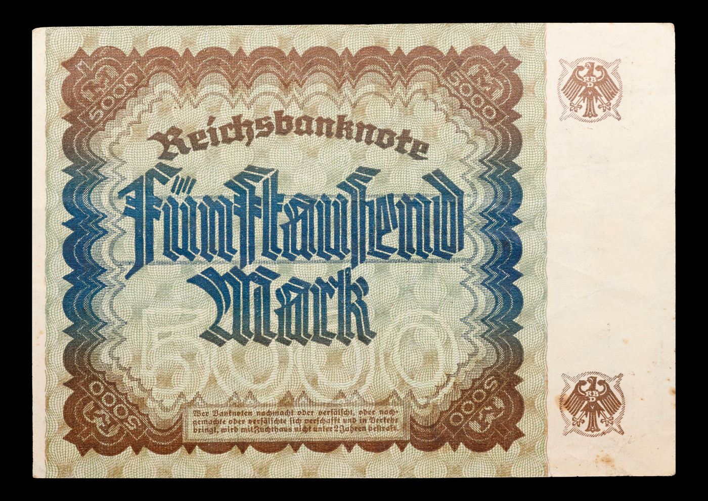 1922 Weimar Germany 5000 Mark Note P# 81C Grades Select AU. In the early 1920s, post-WWI Germany saw its economy spiraling out of control. Hyperinflation started directly after the war in 1918, but truly took over the Weimar Republic from 1921 to 1923. The value of the Mark declined incredibly rapidly. 1 USD was equal to 50 German Marks at the beginning of 1920. Toward the end of 1923, 1 USD was equal to over 4,200,000,000,000 German Marks. At times, denominations of the Mark became less valuable than the paper and labor to print it almost immediately after printing. Thus, denominations of the Mark notes became incredibly large, ending up in the tens of trillions.