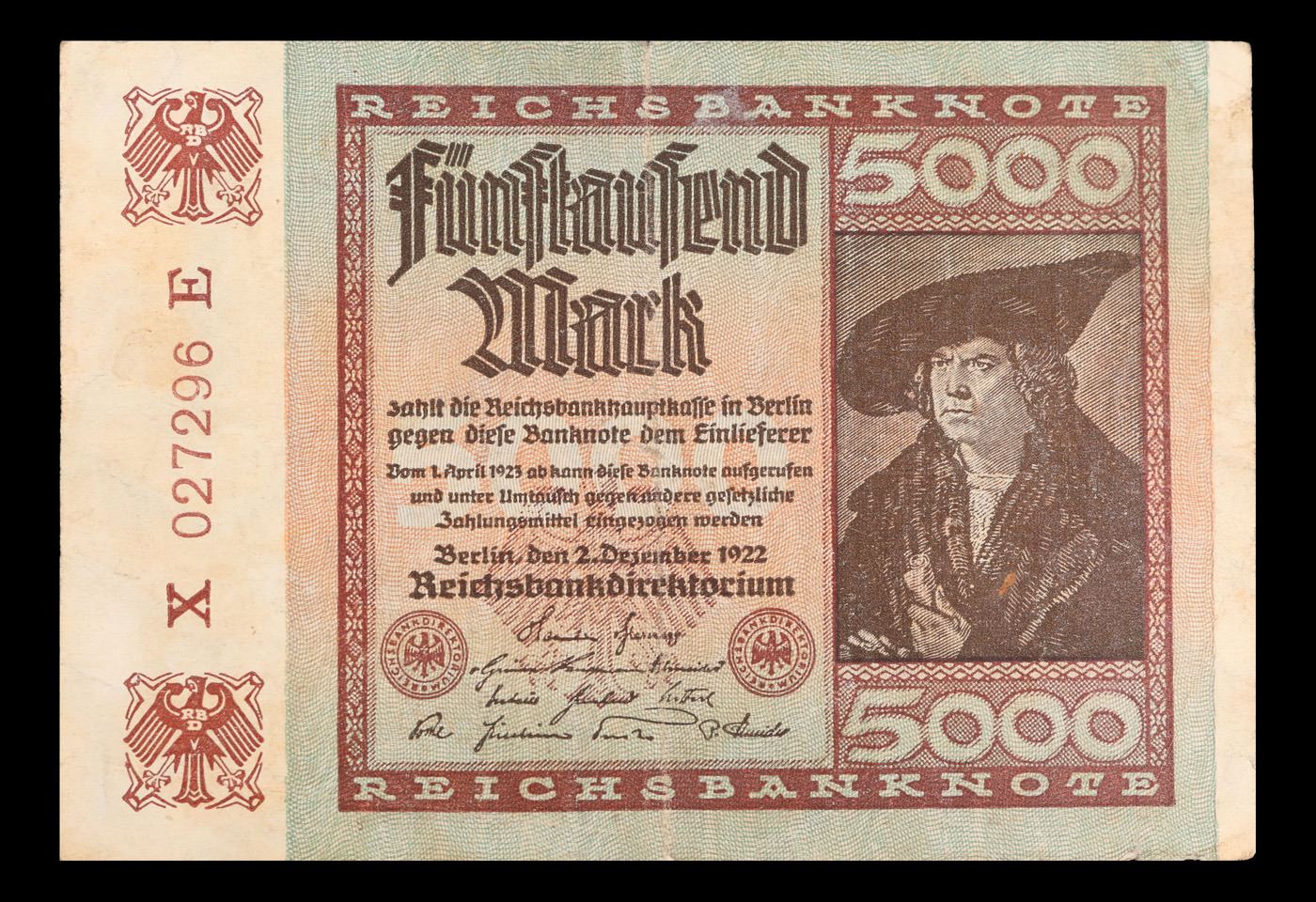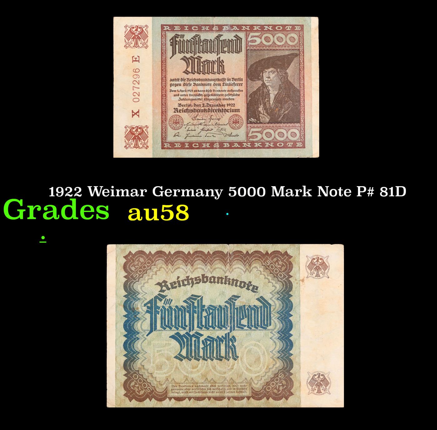 1922 Weimar Germany 5000 Mark Note P# 81D Grades Choice AU/BU Slider. In the early 1920s, post-WWI Germany saw its economy spiraling out of control. Hyperinflation started directly after the war in 1918, but truly took over the Weimar Republic from 1921 to 1923. The value of the Mark declined incredibly rapidly. 1 USD was equal to 50 German Marks at the beginning of 1920. Toward the end of 1923, 1 USD was equal to over 4,200,000,000,000 German Marks. At times, denominations of the Mark became less valuable than the paper and labor to print it almost immediately after printing. Thus, denominations of the Mark notes became incredibly large, ending up in the tens of trillions.
