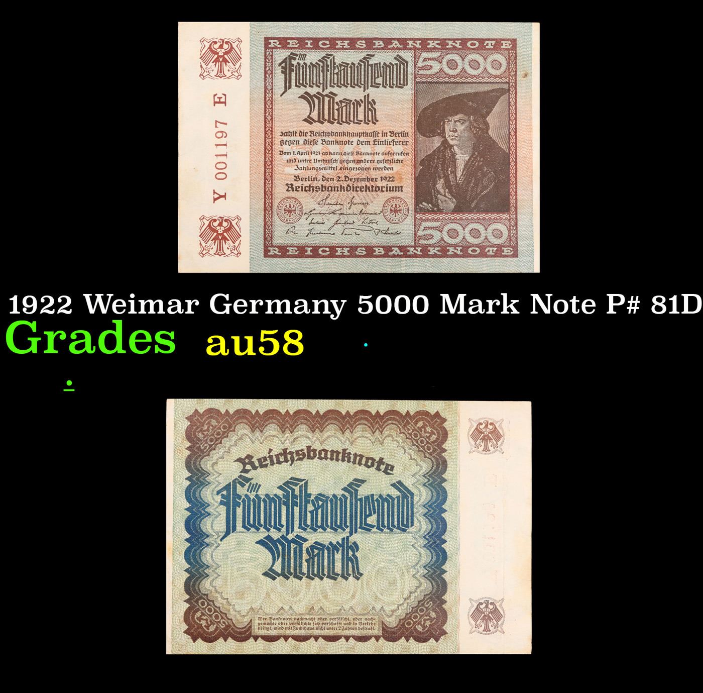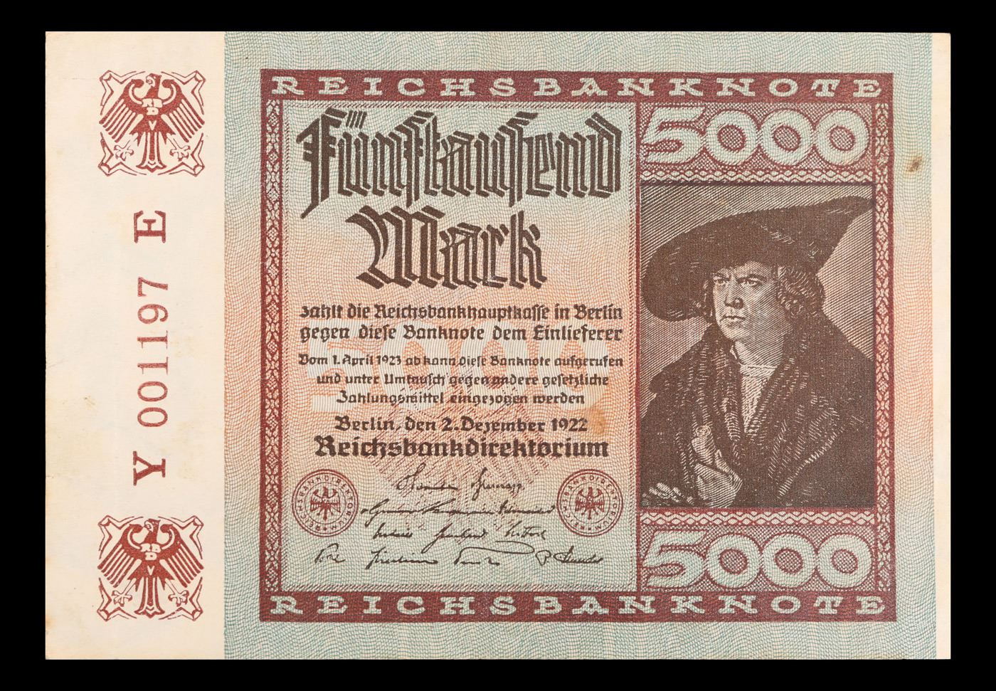 1922 Weimar Germany 5000 Mark Note P# 81D Grades Choice AU/BU Slider. In the early 1920s, post-WWI Germany saw its economy spiraling out of control. Hyperinflation started directly after the war in 1918, but truly took over the Weimar Republic from 1921 to 1923. The value of the Mark declined incredibly rapidly. 1 USD was equal to 50 German Marks at the beginning of 1920. Toward the end of 1923, 1 USD was equal to over 4,200,000,000,000 German Marks. At times, denominations of the Mark became less valuable than the paper and labor to print it almost immediately after printing. Thus, denominations of the Mark notes became incredibly large, ending up in the tens of trillions.