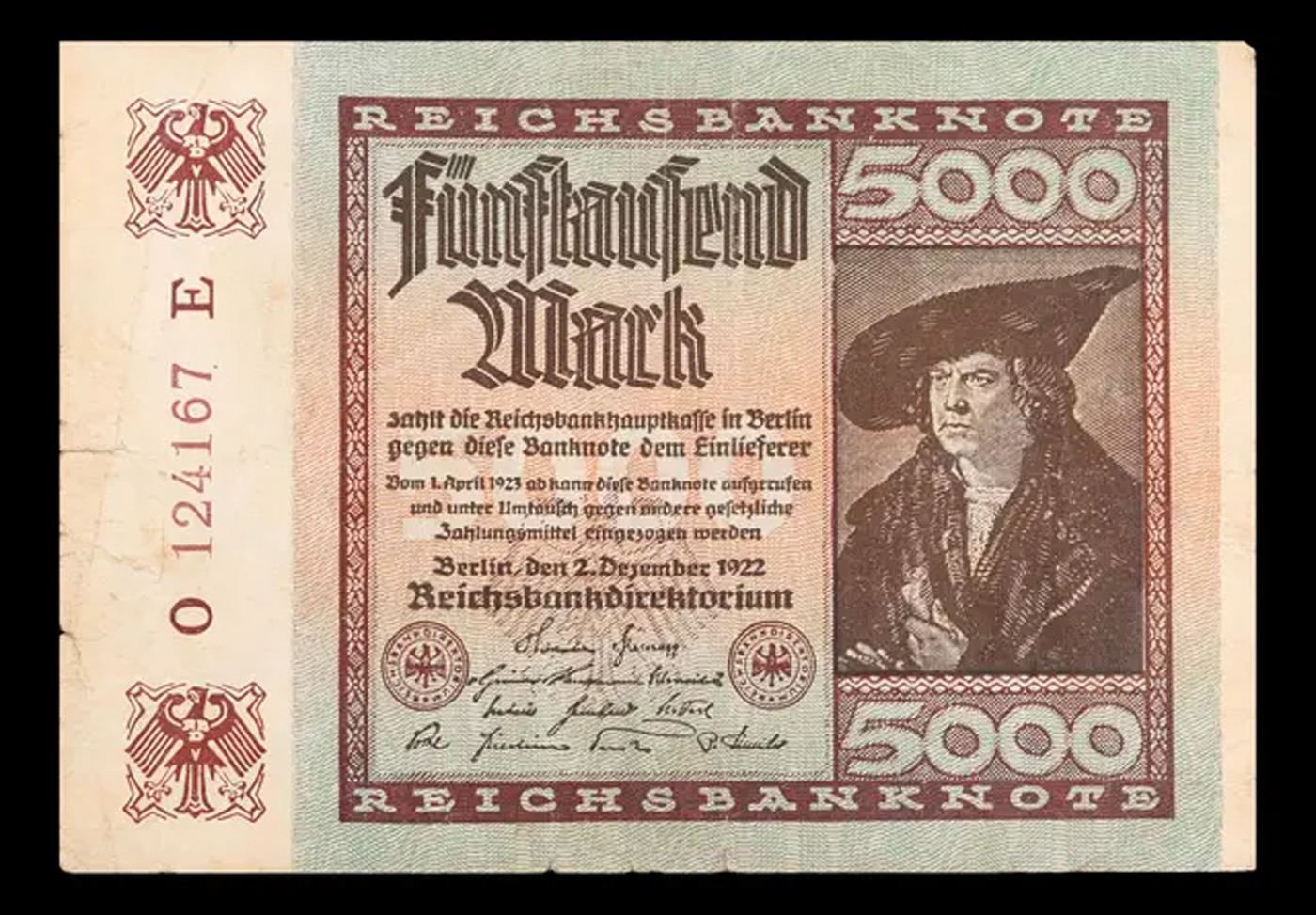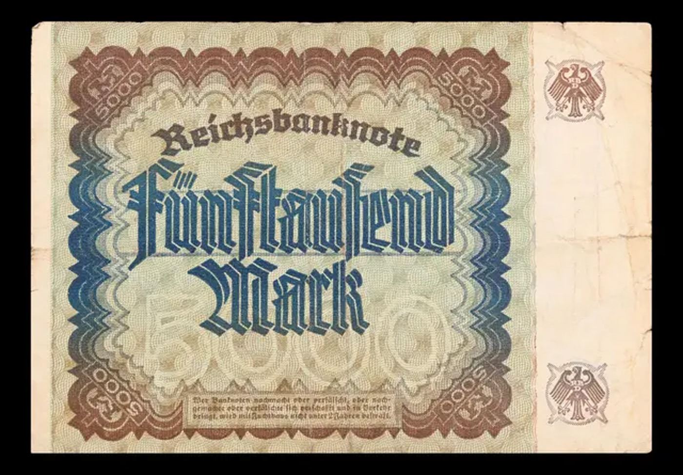 1922 Weimar Germany 5000 Mark Note P# 81D Grades vf++. In the early 1920s, post-WWI Germany saw its economy spiraling out of control. Hyperinflation started directly after the war in 1918, but truly took over the Weimar Republic from 1921 to 1923. The value of the Mark declined incredibly rapidly. 1 USD was equal to 50 German Marks at the beginning of 1920. Toward the end of 1923, 1 USD was equal to over 4,200,000,000,000 German Marks. At times, denominations of the Mark became less valuable than the paper and labor to print it almost immediately after printing. Thus, denominations of the Mark notes became incredibly large, ending up in the tens of trillions.