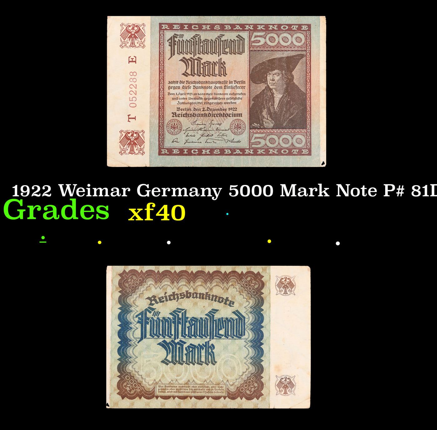 1922 Weimar Germany 5000 Mark Note P# 81D Grades xf. In the early 1920s, post-WWI Germany saw its economy spiraling out of control. Hyperinflation started directly after the war in 1918, but truly took over the Weimar Republic from 1921 to 1923. The value of the Mark declined incredibly rapidly. 1 USD was equal to 50 German Marks at the beginning of 1920. Toward the end of 1923, 1 USD was equal to over 4,200,000,000,000 German Marks. At times, denominations of the Mark became less valuable than the paper and labor to print it almost immediately after printing. Thus, denominations of the Mark notes became incredibly large, ending up in the tens of trillions.