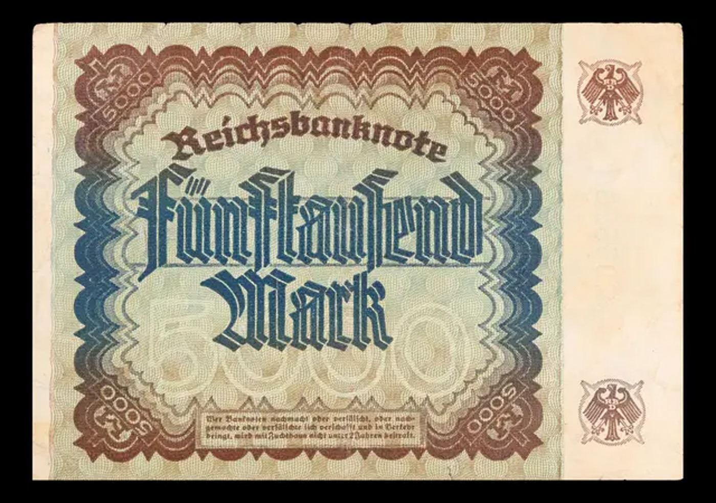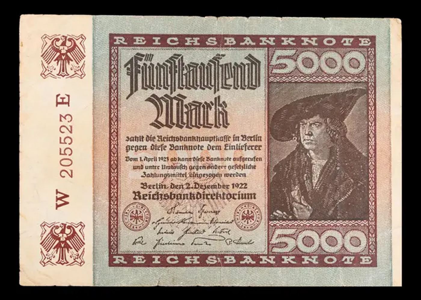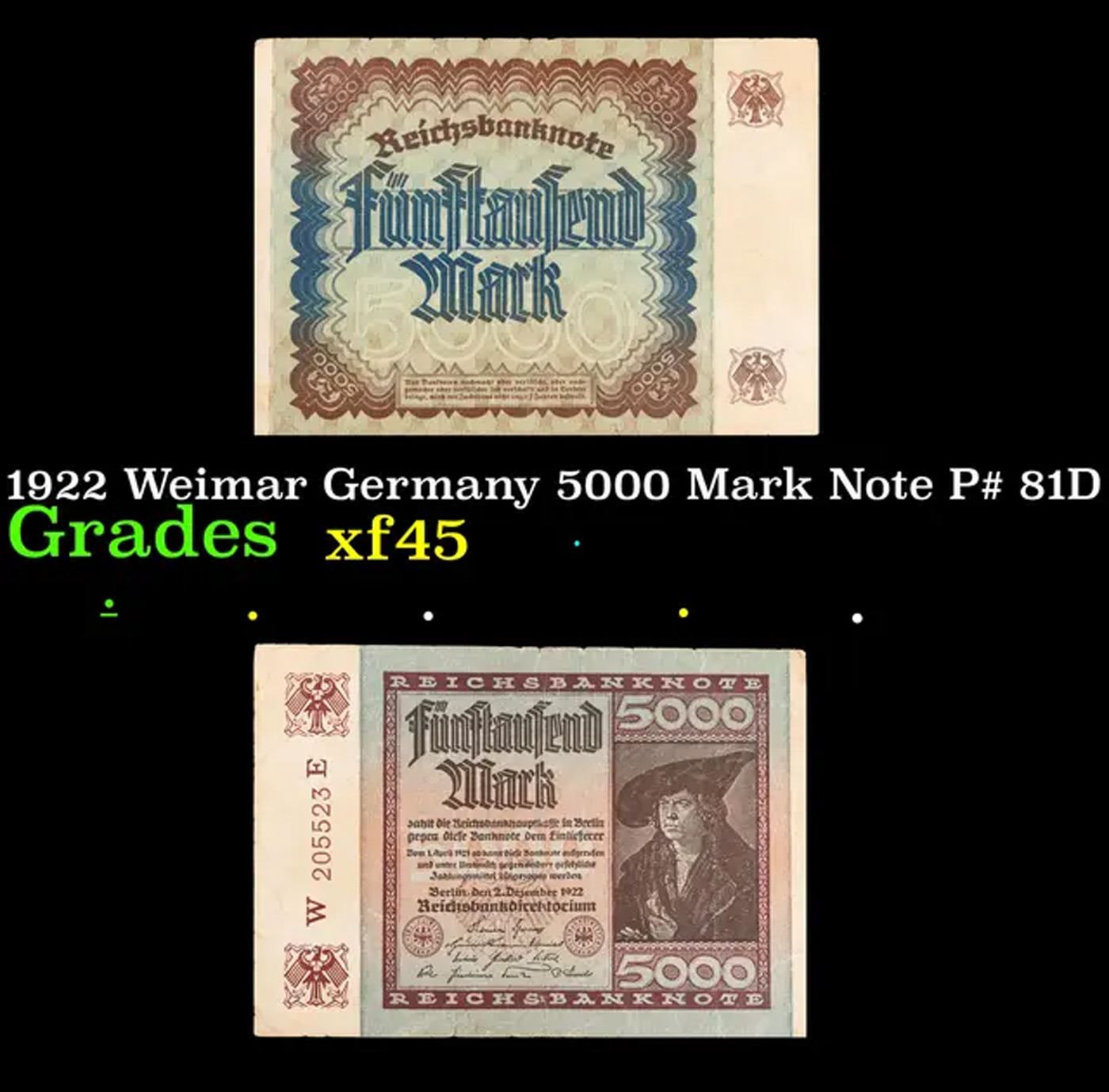 1922 Weimar Germany 5000 Mark Note P# 81D Grades xf+. In the early 1920s, post-WWI Germany saw its economy spiraling out of control. Hyperinflation started directly after the war in 1918, but truly took over the Weimar Republic from 1921 to 1923. The value of the Mark declined incredibly rapidly. 1 USD was equal to 50 German Marks at the beginning of 1920. Toward the end of 1923, 1 USD was equal to over 4,200,000,000,000 German Marks. At times, denominations of the Mark became less valuable than the paper and labor to print it almost immediately after printing. Thus, denominations of the Mark notes became incredibly large, ending up in the tens of trillions.