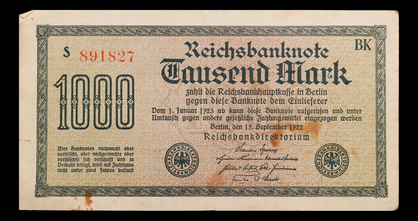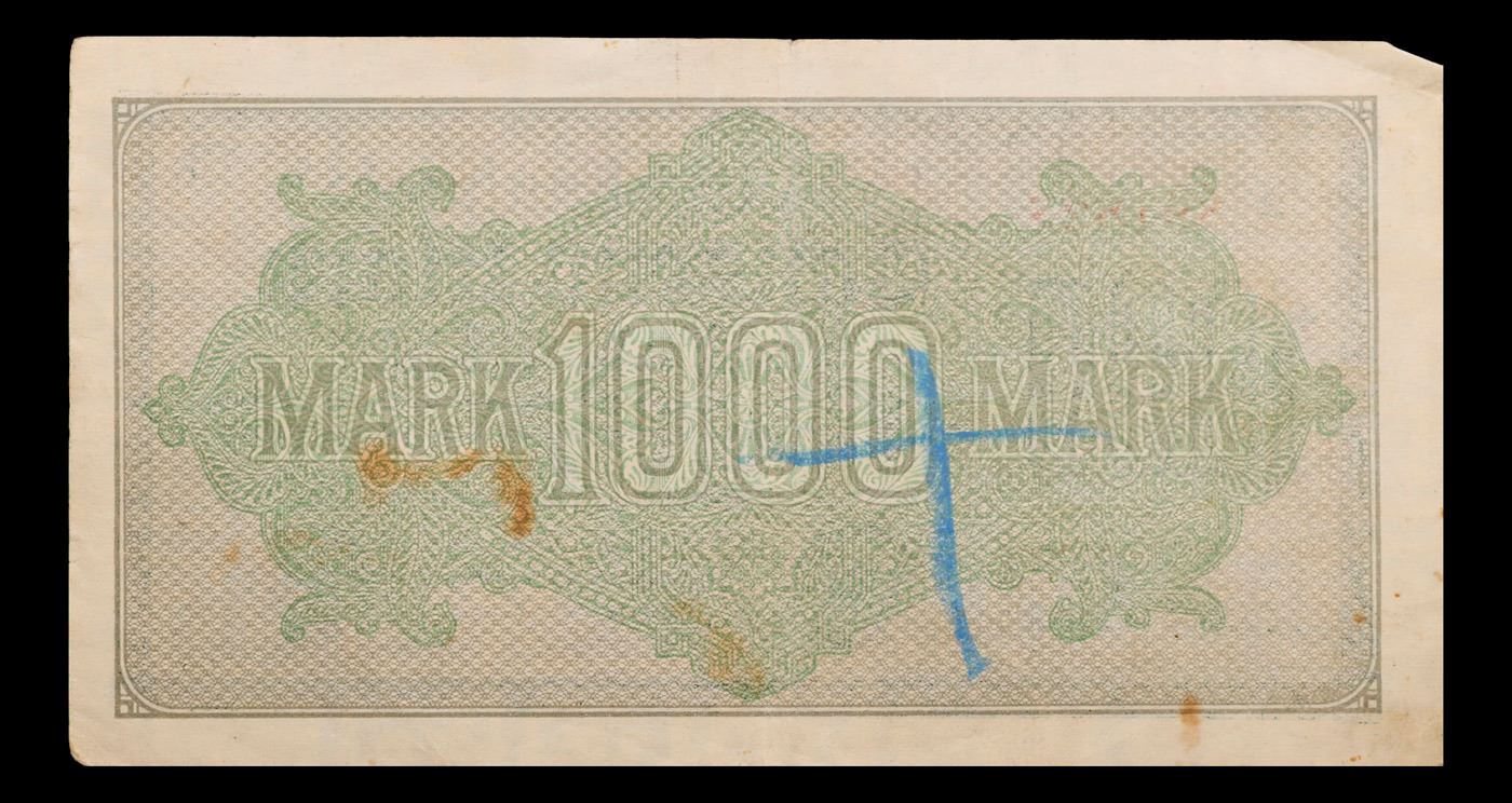 1922 Weimar Germnay 1,000 Mark Note P: 76B Grades Choice AU/BU Slider. Notgeld is German for "emergency/necessity money". Notgeld typically refers to German and Austrian notes produced in the post-WWI period. Somewhat similar to Depression Scrip in the USA, these notes were issued when there wasn'te nough state-produced money available from the central bank. Issuing institutions were often a town's savings banks, municipalities, or private or state-owned firms. Nearly all issues contained an expiry date, after which time they were invalid. Issues without dates ordinarily had an expiry announced in a newspaper or at the place of issuance.