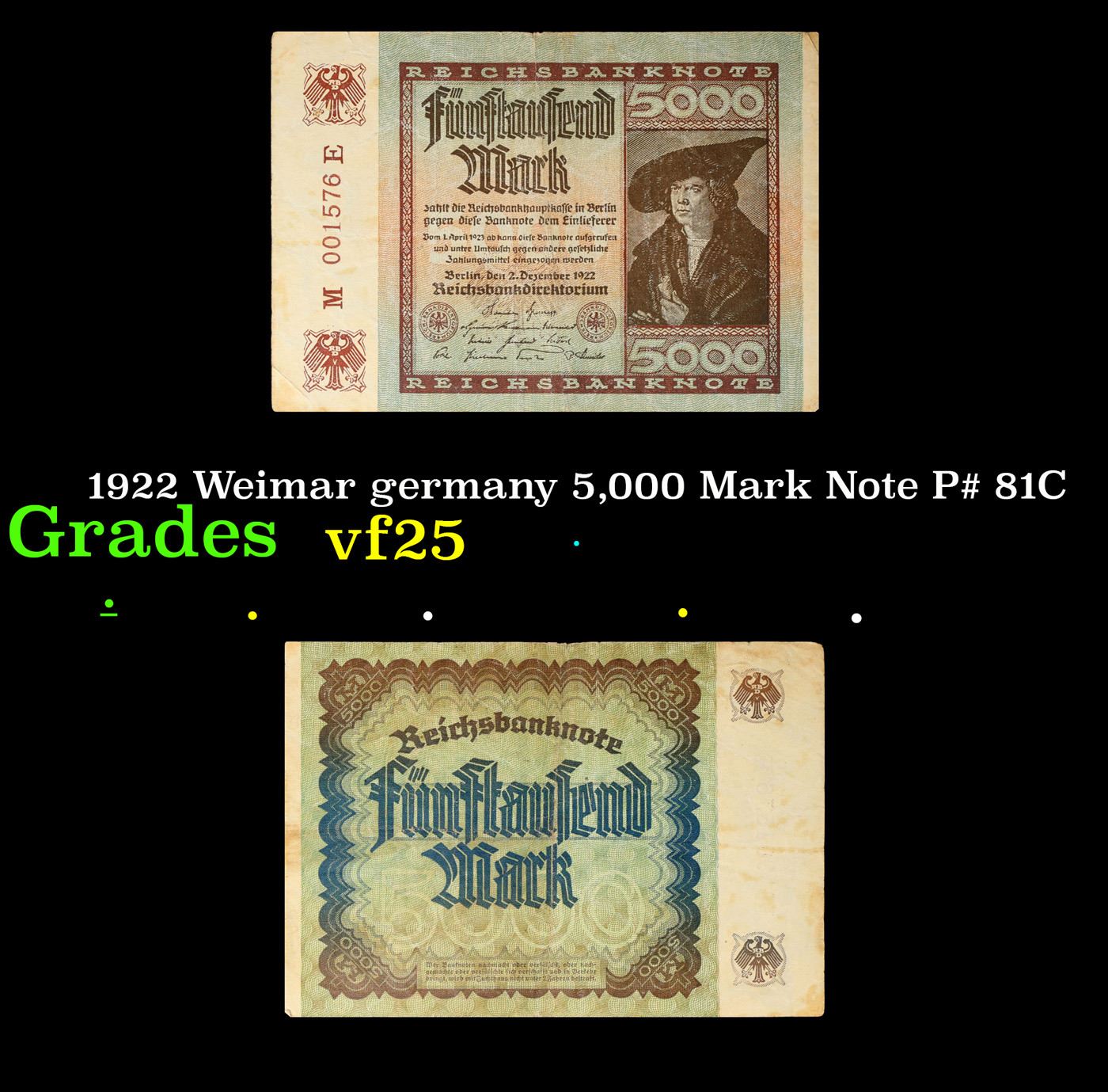1922 Weimar germany 5,000 Mark Note P# 81C Grades vf+