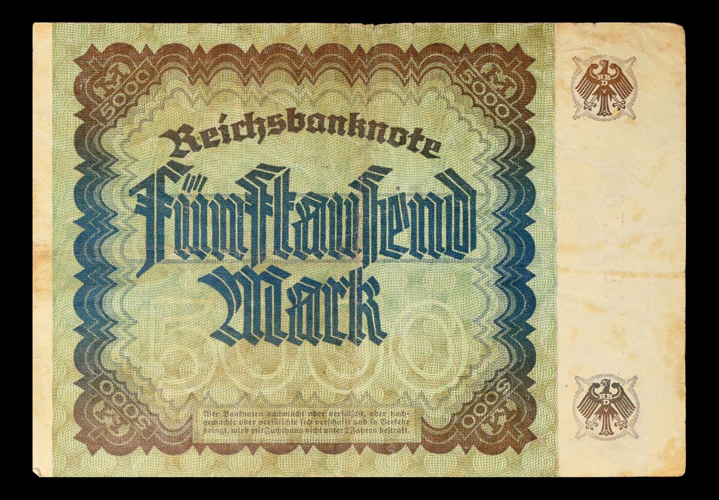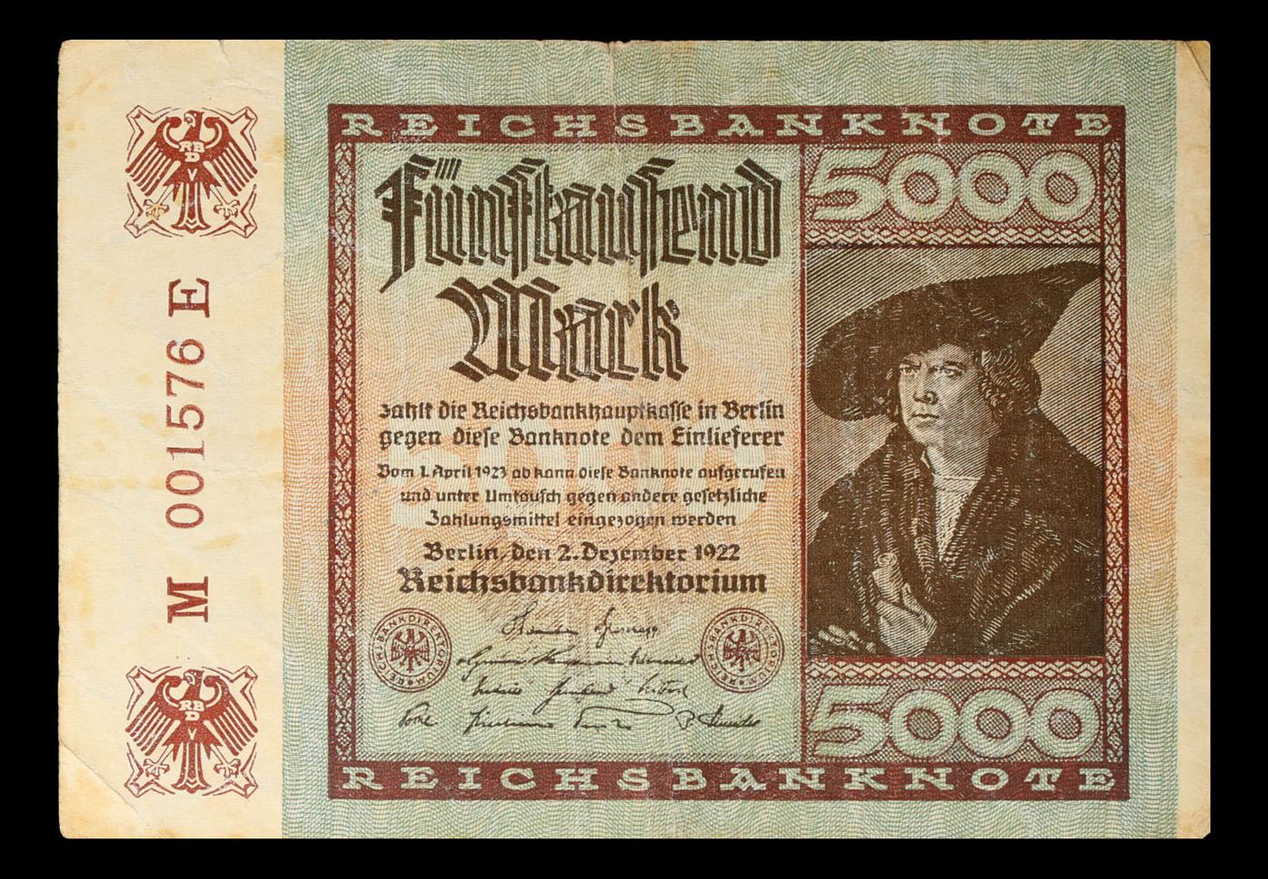 1922 Weimar germany 5,000 Mark Note P# 81C Grades vf+. In the early 1920s, post-WWI Germany saw its economy spiraling out of control. Hyperinflation started directly after the war in 1918, but truly took over the Weimar Republic from 1921 to 1923. The value of the Mark declined incredibly rapidly. 1 USD was equal to 50 German Marks at the beginning of 1920. Toward the end of 1923, 1 USD was equal to over 4,200,000,000,000 German Marks. At times, denominations of the Mark became less valuable than the paper and labor to print it almost immediately after printing. Thus, denominations of the Mark notes became incredibly large, ending up in the tens of trillions.