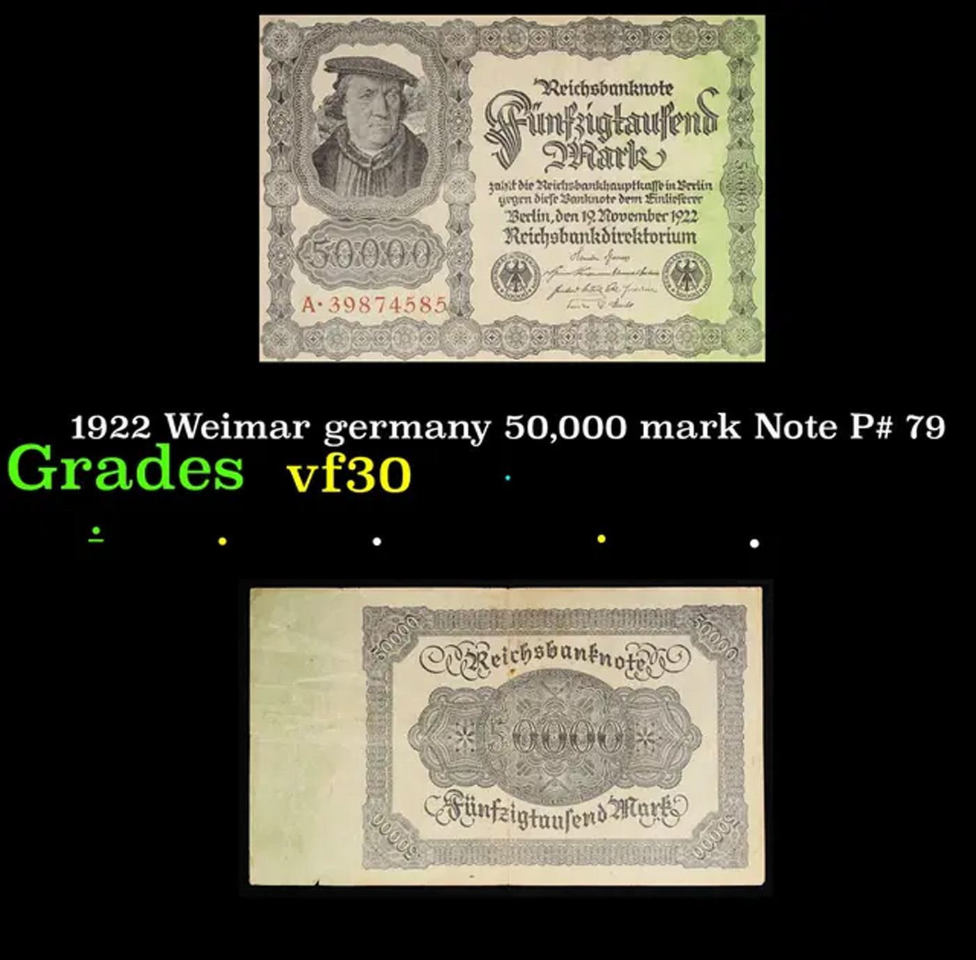 1922 Weimar germany 50,000 mark Note P# 79 Grades vf++. In the early 1920s, post-WWI Germany saw its economy spiraling out of control. Hyperinflation started directly after the war in 1918, but truly took over the Weimar Republic from 1921 to 1923. The value of the Mark declined incredibly rapidly. 1 USD was equal to 50 German Marks at the beginning of 1920. Toward the end of 1923, 1 USD was equal to over 4,200,000,000,000 German Marks. At times, denominations of the Mark became less valuable than the paper and labor to print it almost immediately after printing. Thus, denominations of the Mark notes became incredibly large, ending up in the tens of trillions.