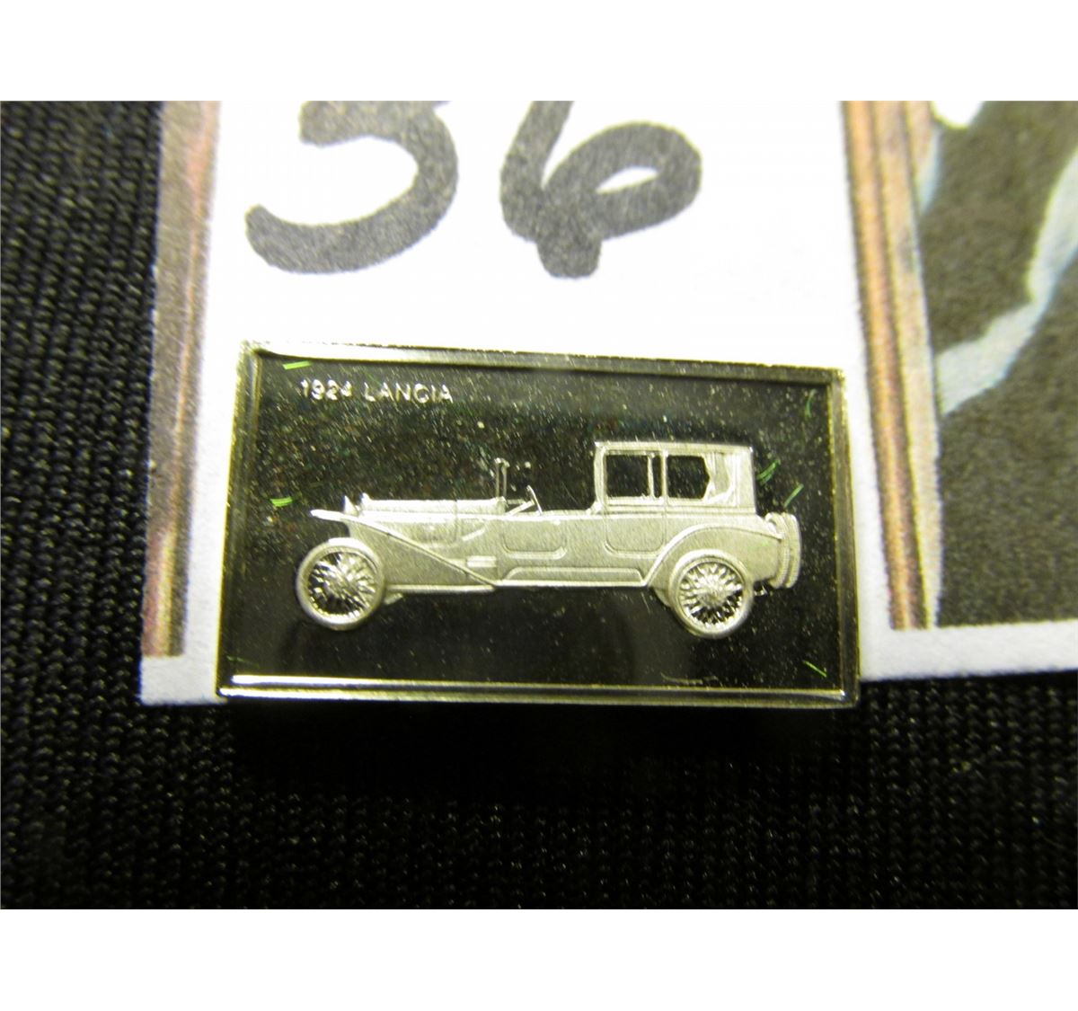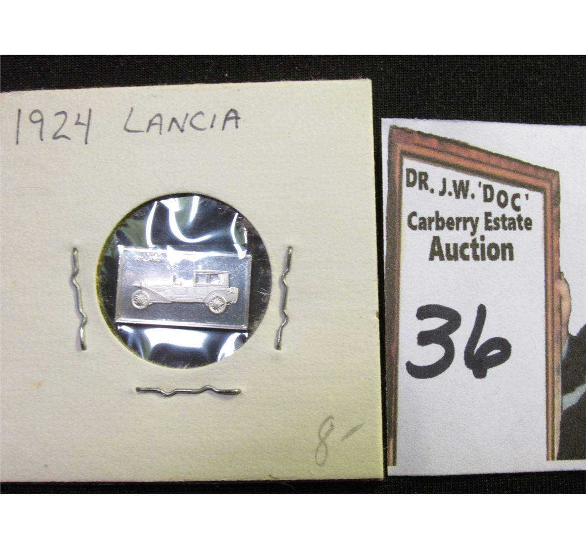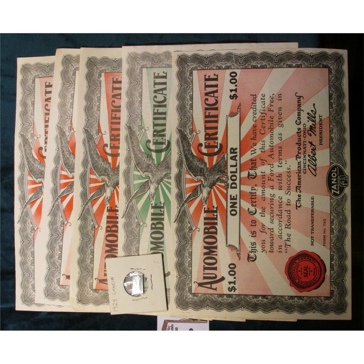 1922 era "Automobile Certificate One, Two, Three, Ten, & Fifteen Dollars…a New Ford Automobile…The American Products Company Cincinnati-Ohio"; & "1924 Lancia" Sterling Silver ingot, Proof, 10mm x 17mm. Would make a nice display item with a Classic Automobile.