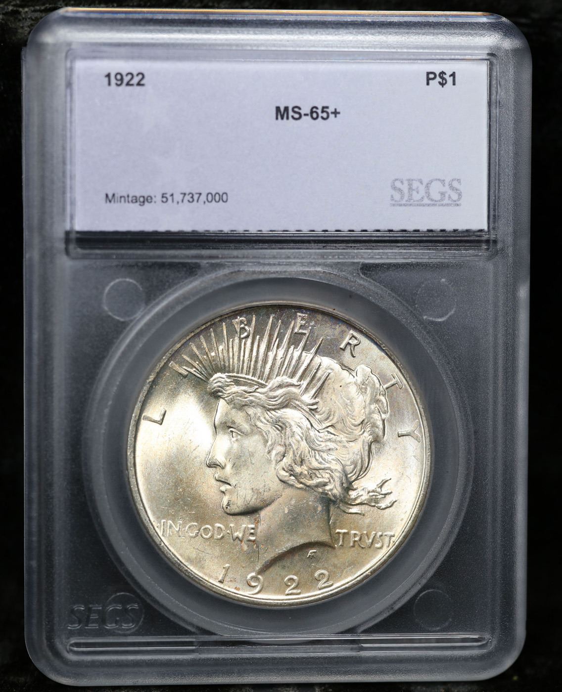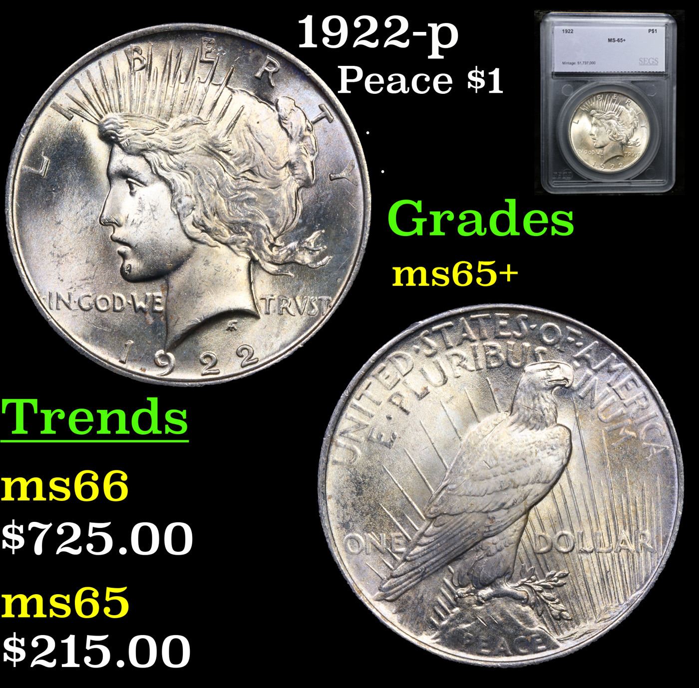 1922-p Peace Dollar $1 Graded ms65+ By SEGS.
