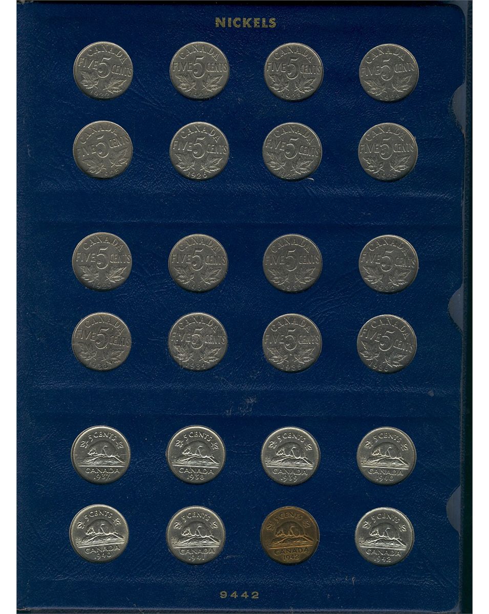 1922 to 1967 5¢ Lot. Almost complete collection comes in old blue Whitman holder (Nickels Miscellaneous. Includes 80+ coins with the 1925, 1926 Nr & 1947 dot. VG to EF.