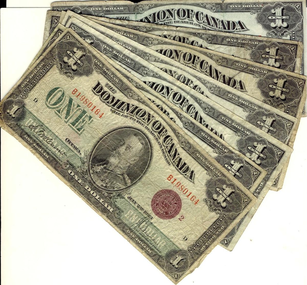 1923 $1 DC-25. Lot of 8 notes of various signatures and seal colours. Good to Fine.