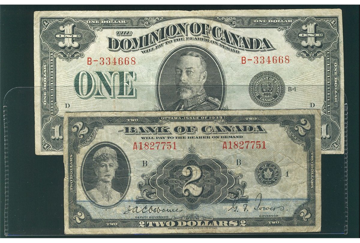 1923 $1 DC-25a & 1935 $2 BC-3. Lot of 2 notes VG to Fine.