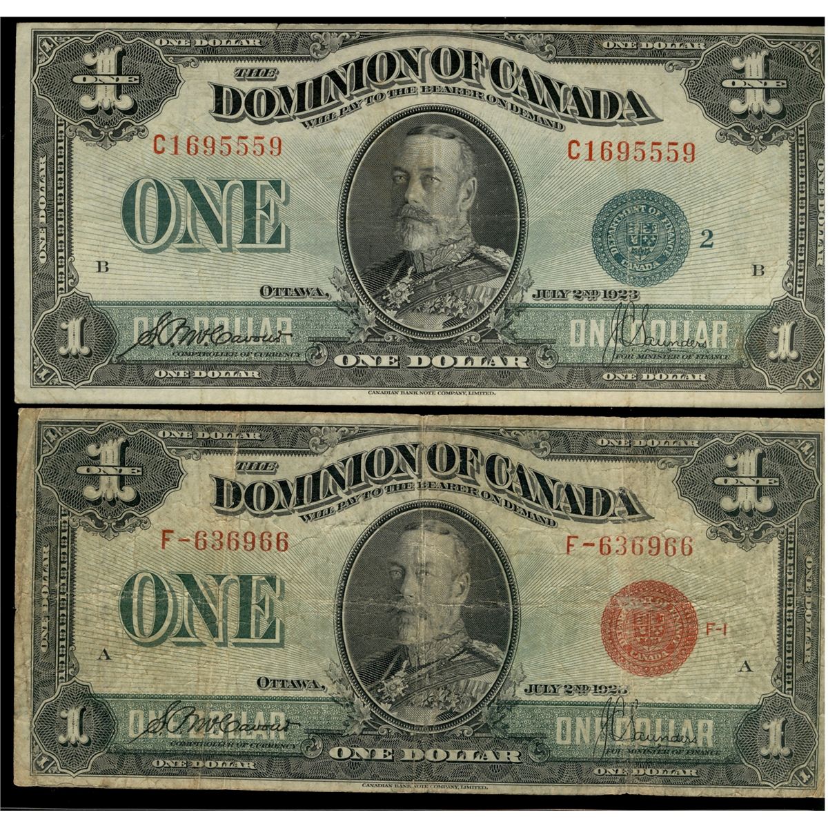 1923 $1 DC-25b #F-636966 & DC-25J #C1695559. Lot of 2 notes with minor issues Fine to VF.