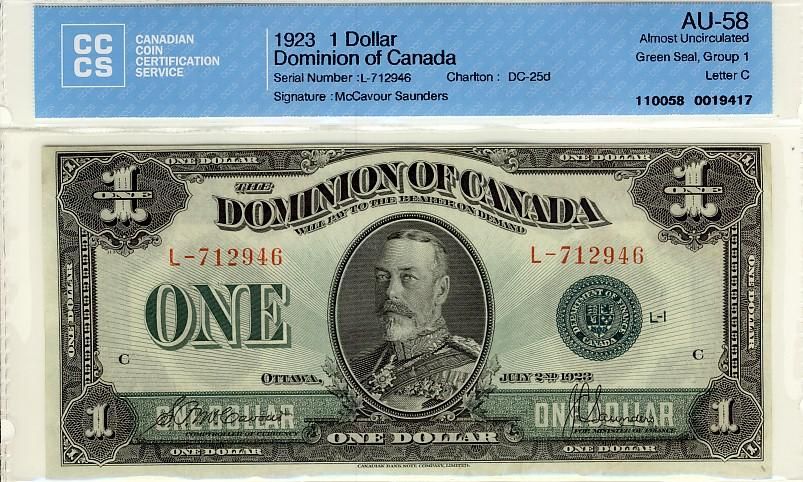 1923 $1 DC-25d L-712946 CCCS AU58, looks uncirculated.