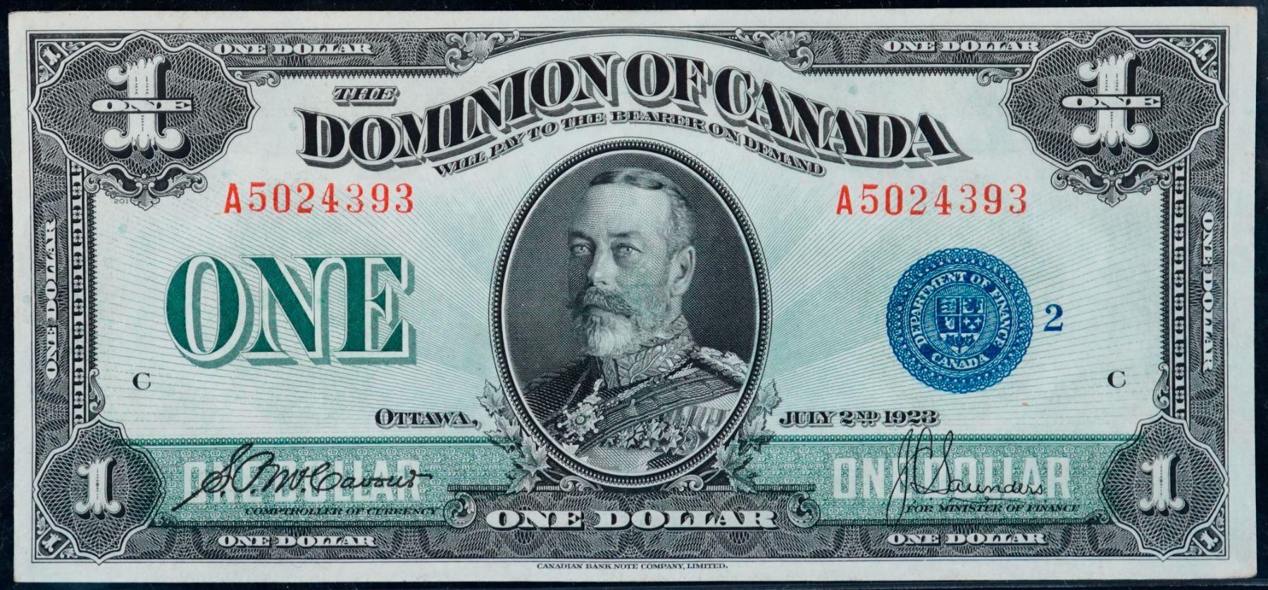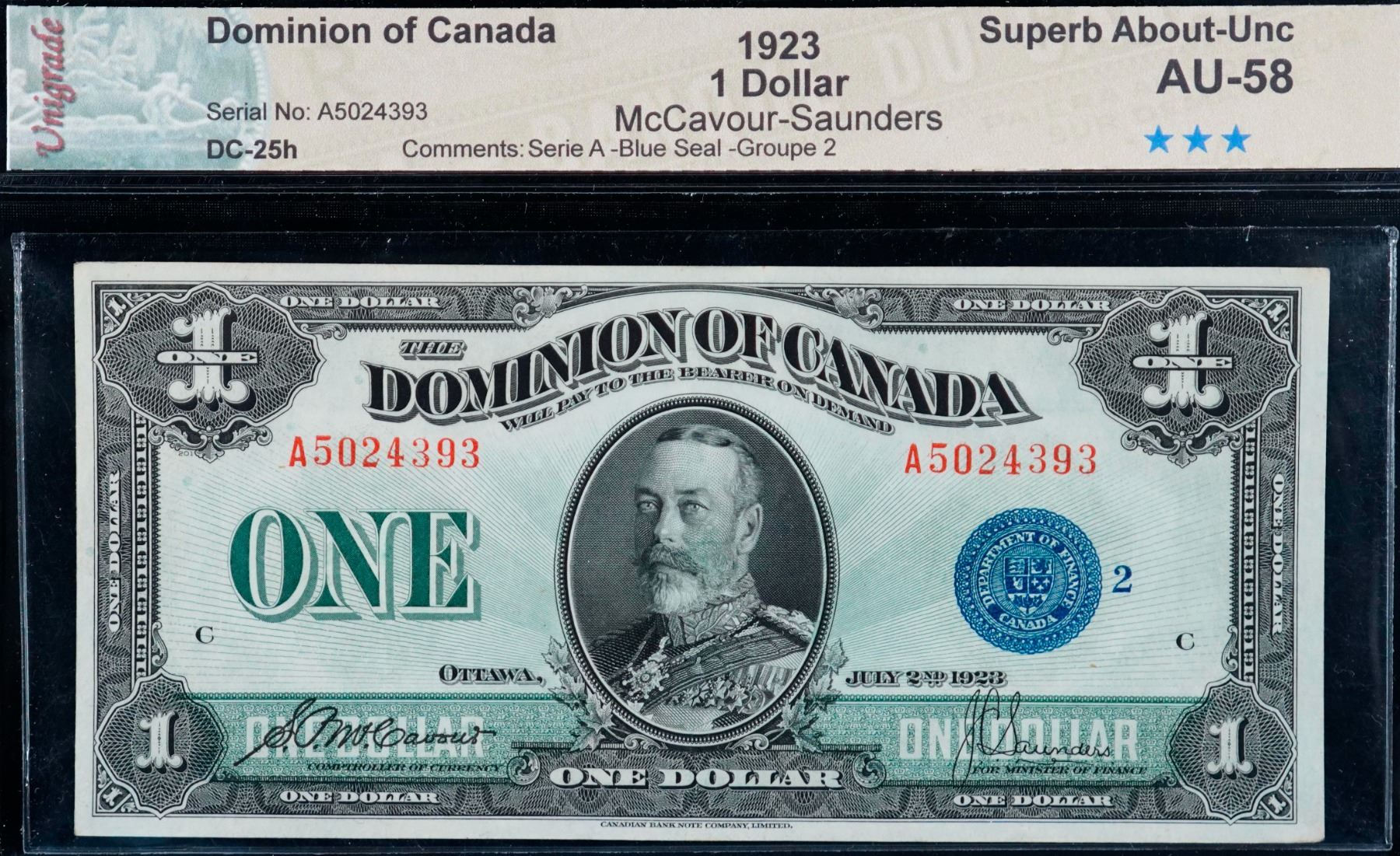 1923 $1 DC-25h #A5024393 Unigrade Choice About Uncirculated-58. A bright example with nice colours.