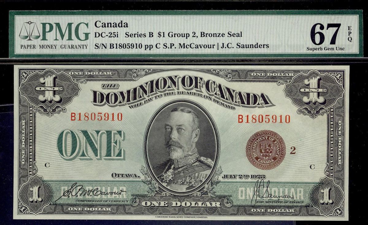 1923 $1 DC-25i #B1805910 PMG Superb Gem UNC67 EPQ. WOW! Simply an amazing example with great colours and centering. Very rare in this condition. Worth a premium bid.